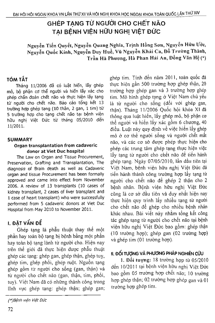 The Law on Organ and Tissue Procurement, Preservation, Grafting and Transplantation, The diagnosis of Brain death as well as Cadaveric organ and tissue Procurement has been formally approved and came into effect from November 2006. A review of 13 transplants (10 cases of kidney transplant, 2 cases of liver transplant and 1 case of heart transplant) who were successfully performed from 5 cadaveric donors at Viet Duc Hospital from May 2010 to November 2011.