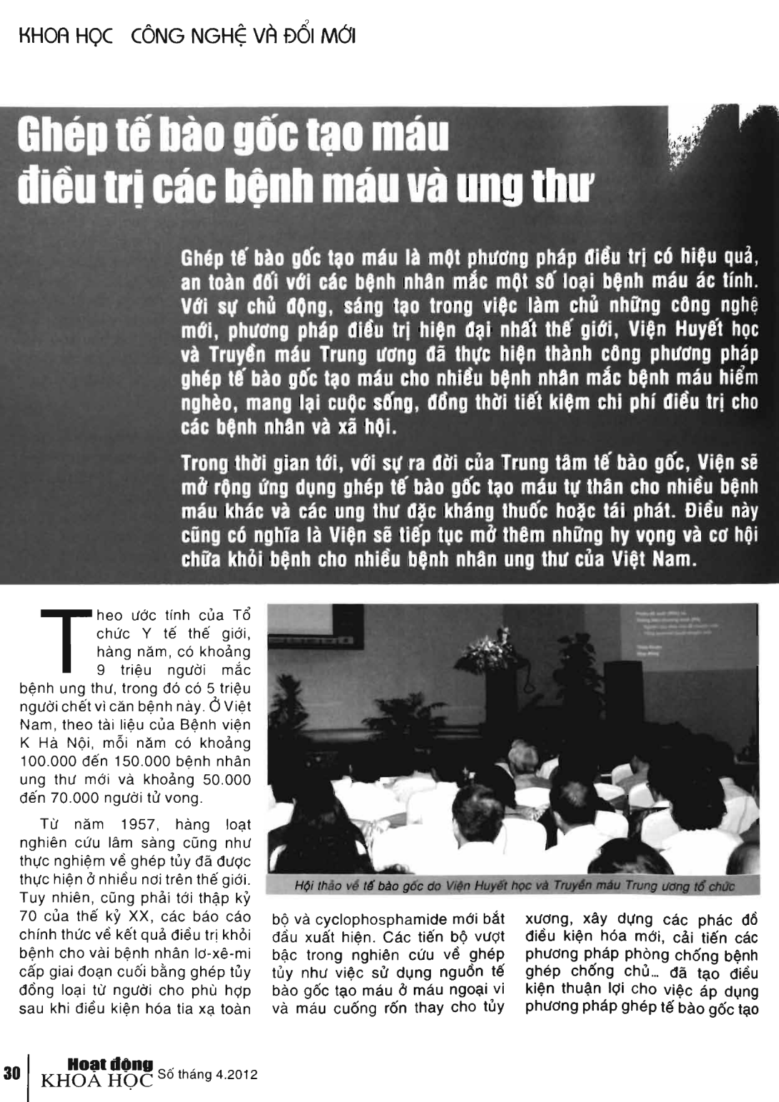 Hematopoietic stem cell transplantation is a treatment method to be effective and safe for patients with certain malignant blood diseases. With proactive and creative in mastering the new technology, modern treatment methods, Central Institute of Hematology and Blood Transfusion of Vietnam has successfully implemented method of hematopoietic stem cell transplantation for many patients infected dangerous blood, bringing life saving treatment costs for patients and society.