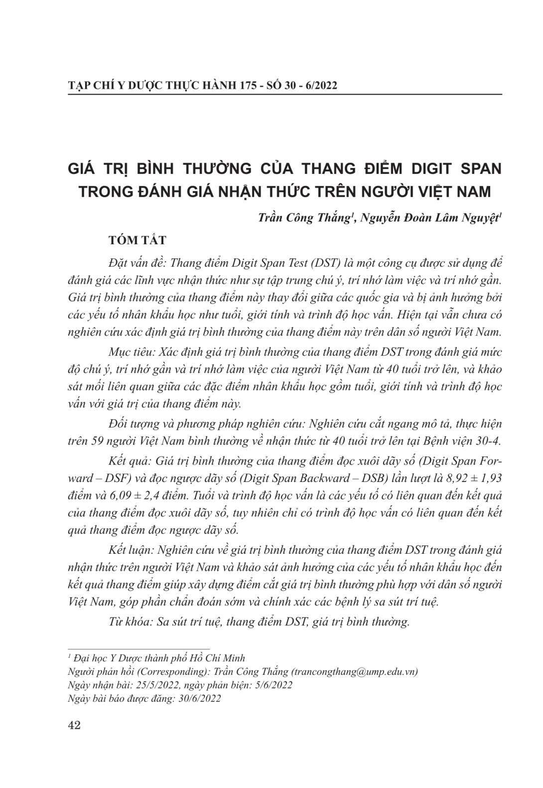 Thang điểm Digit Span Test (DST) là một công cụ được sử dụng để đánh giá các lĩnh vực nhận thức như sự tập trung chú ý, trí nhớ làm việc và trí nhớ gần. Giá trị bình thường của thang điểm này thay đổi giữa các quốc gia và bị ảnh hưởng bởi các yếu tố nhân khẩu học như tuổi, giới tính và trình độ học vấn. Hiện tại vẫn chưa có nghiên cứu xác định giá trị bình thường của thang điểm này trên dân số người Việt Nam. Mục tiêu: Xác định giá trị bình thường của thang điểm DST trong đánh giá mức độ chú ý, trí nhớ gần và trí nhớ làm việc của người Việt Nam từ 40 tuổi trở lên, và khảo sát mối liên quan giữa các đặc điểm nhân khẩu học gồm tuổi, giới tính và trình độ học vấn với giá trị của thang điểm này. Đối tượng và phương pháp nghiên cứu: Nghiên cứu cắt ngang mô tả, thực hiện trên 59 người Việt Nam bình thường về nhận thức từ 40 tuổi trở lên tại Bệnh viện 30-4. Kết quả: Giá trị bình thường của thang điểm đọc xuôi dãy số (Digit Span Forward – DSF) và đọc ngược dãy số (Digit Span Backward – DSB) lần lượt là 8,92 ± 1,93 điểm và 6,09 ± 2,4 điểm. Tuổi và trình độ học vấn là các yếu tố có liên quan đến kết quả của thang điểm đọc xuôi dãy số, tuy nhiên chỉ có trình độ học vấn có liên quan đến kết quả thang điểm đọc ngược dãy số. Kết luận: Nghiên cứu về giá trị bình thường của thang điểm DST trong đánh giá nhận thức trên người Việt Nam và khảo sát ảnh hưởng của các yếu tố nhân khẩu học đến kết quả thang điểm giúp xây dựng điểm cắt giá trị bình thường phù hợp với dân số người Việt Nam, góp phần chẩn đoán sớm và chính xác các bệnh lý sa sút trí tuệ.