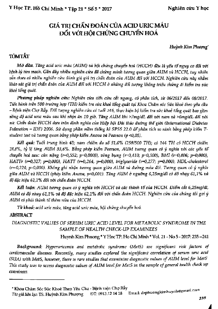Khảo sát giá trị chẩn đoán của acid uric máu đối với hội chứng chuyển hóa trên 500 trường hợp đến khám sức khỏe tổng quát tại bệnh viện Chợ Rẫy từ 6/2017 đến 8/2017. Tuổi trung bình là 43, nam giới chiếm đa số. Có 144 trường hợp có hội chứng chuyển hóa, tỷ lệ tăng acid uric máulà 33,6 phần trăm. Không ghi nhận tương quan giữa acid uric máu và đướng máu đói. Tăng acid uric máu ở ngưỡng 6,25 mg/dl có độ nhạy 61,1 phần trăm và độ đặc hiệu 62,1 phần trăm đối với chẩn đoán hội chứng chuyển hóa.