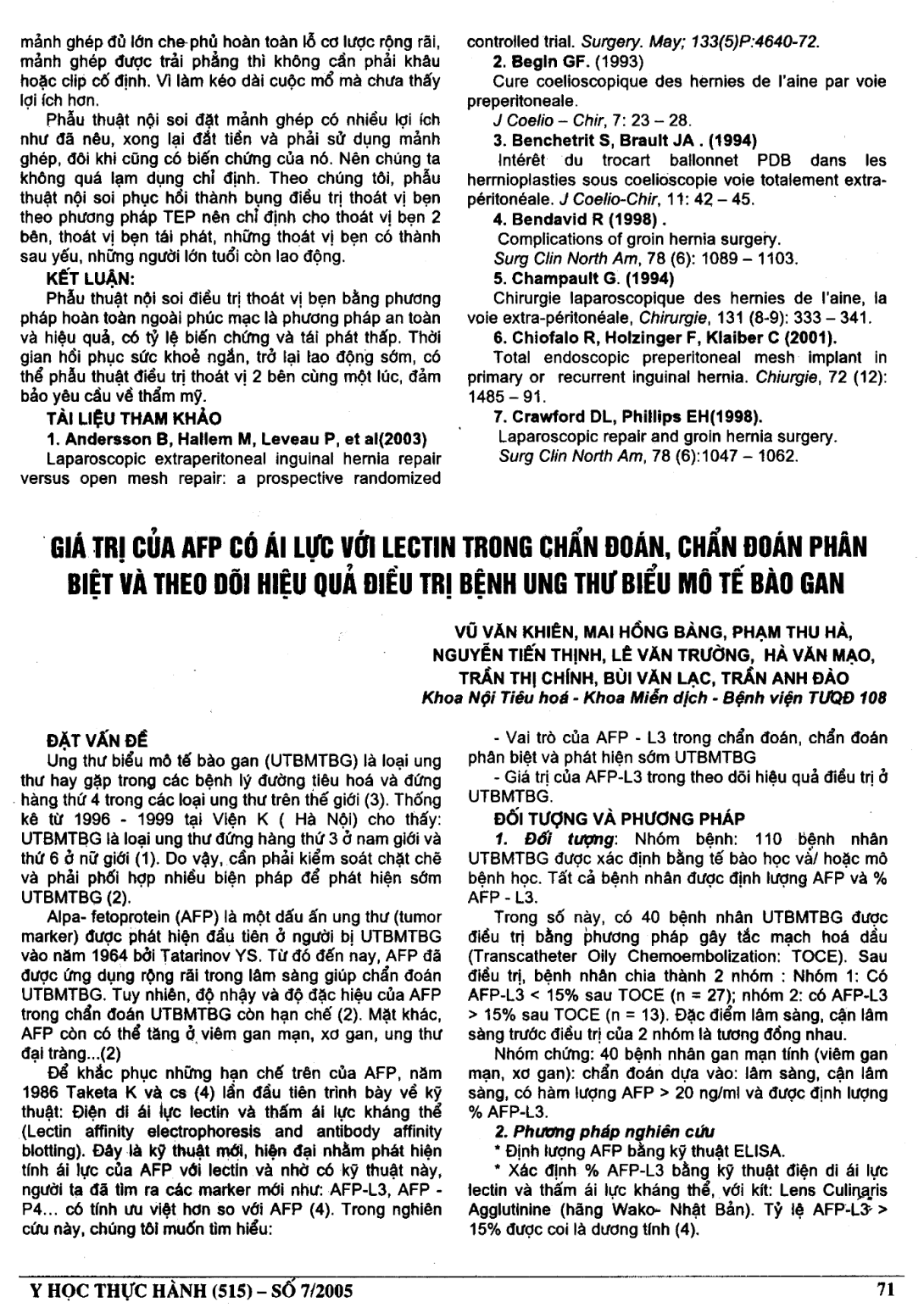 Đánh giá vai trò của AFP-L3 trong chẩn đoán, phân biệt và phát hiện sớm ung thư biểu mô tế bào gan. Xác định giá trị của AFP-L3 trong theo dõi hiệu quả điều trị UTBMTBG.