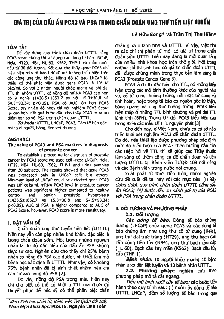 To establish a procedure for diagnosis of prostate cancer by PCA3 score we used cell lines: LNCaP, Hela, HT29, NB4, HL-60, K562, THP-1 and urine samples from 30 subjects. The results showed that gene PCA3 was expressed only in LNCaP cells but others. Minimum level of LNCaP could be detected gene PCA3 was 10 exponent 3 cells/ml. mRNA PCA3 level in prostate cancer patients was significant higher compared to healthy control and benign prostatic hyperplasia (1436.5 + or - 1852.7 vs 15.3 + or - 30.8 and 54.5 + or - 90.34; p0.05). AUC of PSA is higher compared to AUC of PCA3 Score, however, PCA3 score is more sensitivety.