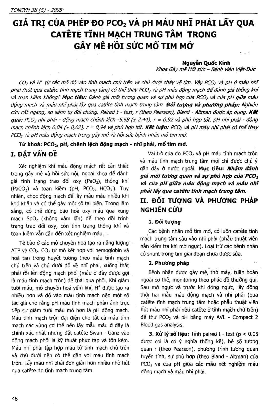 CO2 và H+ từ các mô đổ vào tĩnh mạch chủ trên và chủ dưới chảy về tim. Vậy PCO2 và pH ở máu nhĩ phải (hút qua catête tĩnh mạch trung tâm) có thể thay PCO2 và pH máu động mạch để đánh giá thông khí và toan kiềm không? Đánh gía mối tương quan và sự phù hợp của PCO2 và của pH giữa máu động mạch và máu nhĩ phải lấy qua catête tĩnh mạch trung tâm. Nghiên cứu cắt ngang, so sánh tự đối chứng. Paired t-test, r (theo Pearson), Bland-Altman được áp dụng. PCO2 nhĩ phải-động mạch chênh lệch -5.68 (+-2,44), r = 0,92 và phù hợp tốt. pH nhĩ phải-động mạch chênh lệch 0,04 (+-0,02), r = 0,94 và phù hợp tốt. PCO2 và pH máu nhĩ phải có thể thay PCO2 và pH máu động mạch trong gây mê và hồi sức bệnh nhân mổ tim mở.