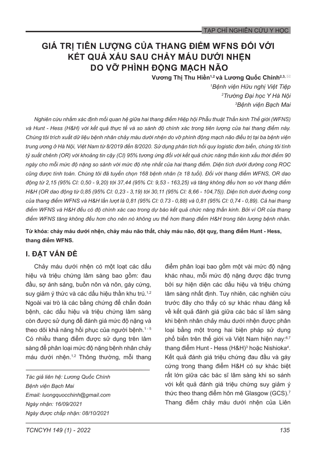 Nghiên cứu nhằm xác định mối quan hệ giữa hai thang điểm Hiệp hội Phẫu thuật Thần kinh Thế giới (WFNS) và Hunt - Hess (H&H) với kết quả thực tế và so sánh độ chính xác trong tiên lượng của hai thang điểm này. Chúng tôi trích xuất dữ liệu bệnh nhân chảy máu dưới nhện do vỡ phình động mạch não điều trị tại ba bệnh viện trung ương ở Hà Nội, Việt Nam từ 8/2019 đến 8/2020. Sử dụng phân tích hồi quy logistic đơn biến, chúng tôi tính tỷ suất chênh (OR) với khoảng tin cậy (CI) 95% tương ứng đối với kết quả chức năng thần kinh xấu thời điểm 90 ngày cho mỗi mức độ nặng so sánh với mức độ nhẹ nhất của hai thang điểm. Diện tích dưới đường cong ROC cũng được tính toán. Chúng tôi đã tuyển chọn 168 bệnh nhân (≥ 18 tuổi). Đối với thang điểm WFNS, OR dao động từ 2,15 (95% CI: 0,50 - 9,20) tới 37,44 (95% CI: 9,53 - 163,25) và tăng không đều hơn so với thang điểm H&H (OR dao động từ 0,85 (95% CI: 0,23 - 3,19) tới 30,11 (95% CI: 8,66 - 104,75)). Diện tích dưới đường cong của thang điểm WFNS và H&H lần lượt là 0,81 (95% CI: 0.73 - 0,88) và 0,81 (95% CI: 0,74 - 0,89). Cả hai thang điểm WFNS và H&H đều có độ chính xác cao trong dự báo kết quả chức năng thần kinh. Bởi vì OR của thang điểm WFNS tăng không đều hơn cho nên nó không ưu thế hơn thang điểm H&H trong tiên lượng bệnh nhân.