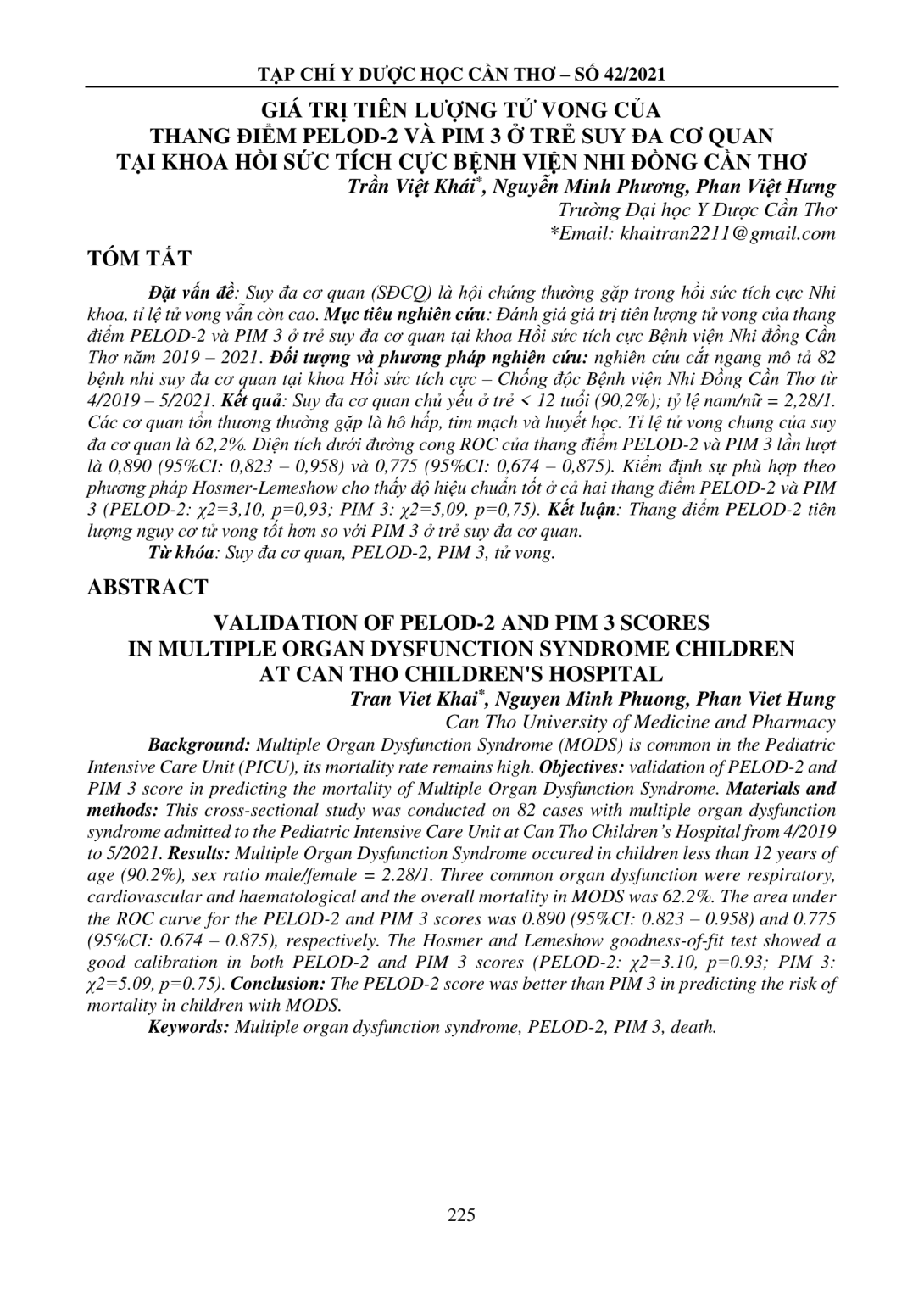 Suy đa cơ quan (SĐCQ) là hội chứng thường gặp trong hồi sức tích cực Nhi khoa, tỉ lệ tử vong vẫn còn cao. Mục tiêu nghiên cứu: Đánh giá giá trị tiên lượng tử vong của thang điểm PELOD-2 và PIM 3 ở trẻ suy đa cơ quan tại khoa Hồi sức tích cực Bệnh viện Nhi đồng Cần Thơ năm 2019 – 2021. Đối tượng và phương pháp nghiên cứu: nghiên cứu cắt ngang mô tả 82 bệnh nhi suy đa cơ quan tại khoa Hồi sức tích cực – Chống độc Bệnh viện Nhi Đồng Cần Thơ từ 4/2019 – 5/2021. Kết quả: Suy đa cơ quan chủ yếu ở trẻ < 12 tuổi (90,2%); tỷ lệ nam/nữ = 2,28/1. Các cơ quan tổn thương thường gặp là hô hấp, tim mạch và huyết học. Tỉ lệ tử vong chung của suy đa cơ quan là 62,2%. Diện tích dưới đường cong ROC của thang điểm PELOD-2 và PIM 3 lần lượt là 0,890 (95%CI: 0,823 – 0,958) và 0,775 (95%CI: 0,674 – 0,875). Kiểm định sự phù hợp theo phương pháp Hosmer-Lemeshow cho thấy độ hiệu chuẩn tốt ở cả hai thang điểm PELOD-2 và PIM 3 (PELOD-2: χ2=3,10, p=0,93; PIM 3: χ2=5,09, p=0,75). Kết luận: Thang điểm PELOD-2 tiên lượng nguy cơ tử vong tốt hơn so với PIM 3 ở trẻ suy đa cơ quan.