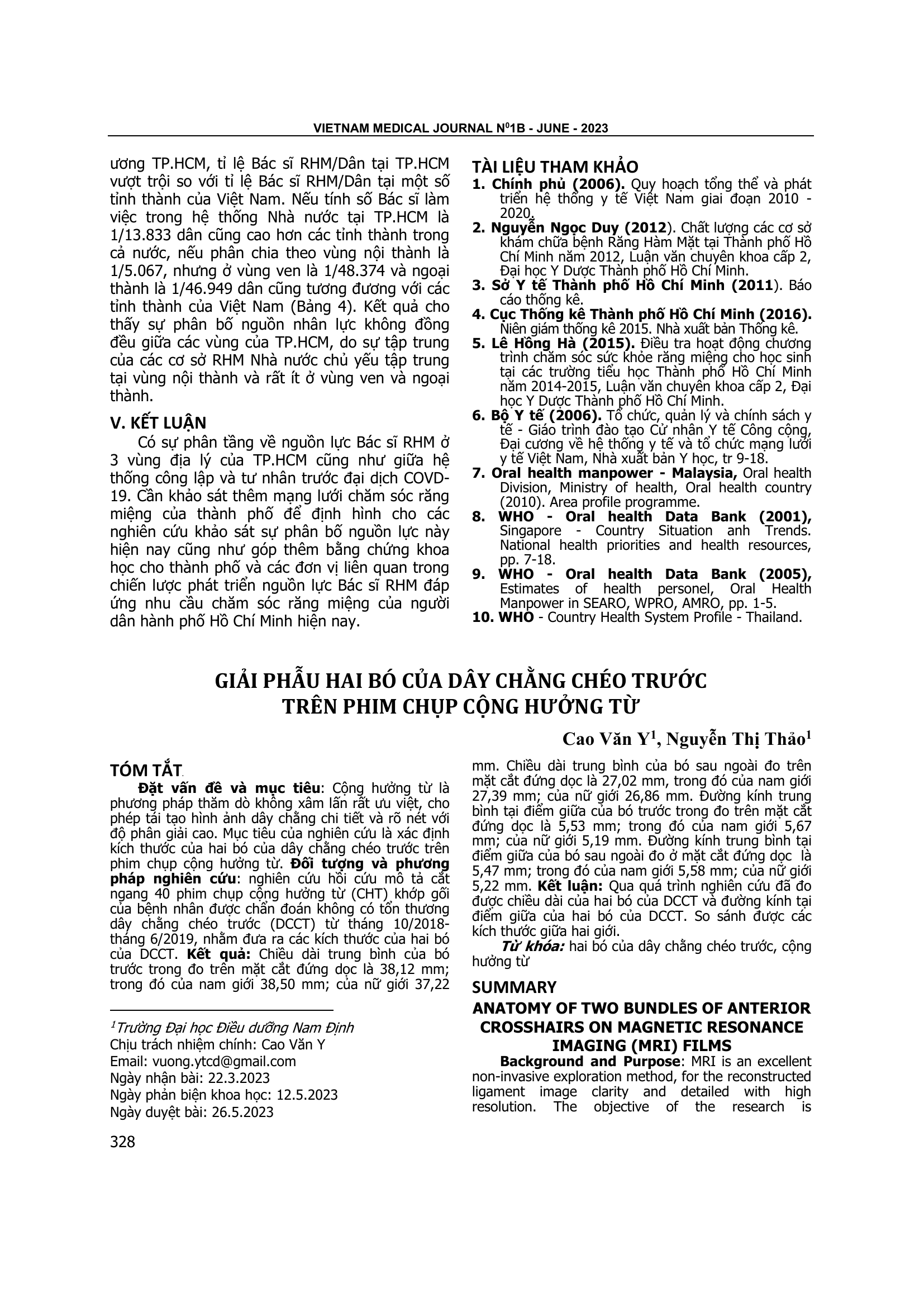 Cộng hưởng từ là phương pháp thăm dò không xâm lấn rất ưu việt, cho phép tái tạo hình ảnh dây chằng chi tiết và rõ nét với độ phân giải cao. Mục tiêu của nghiên cứu là xác định kích thước của hai bó của dây chằng chéo trước trên phim chụp cộng hưởng từ. Đối tượng và phương pháp nghiên cứu: nghiên cứu hồi cứu mô tả cắt ngang 40 phim chụp cộng hưởng từ (CHT) khớp gối của bệnh nhân được chẩn đoán không có tổn thương dây chằng chéo trước (DCCT) từ tháng 10/2018- tháng 6/2019, nhằm đưa ra các kích thước của hai bó của DCCT. Kết quả: Chiều dài trung bình của bó trước trong đo trên mặt cắt đứng dọc là 38,12 mm; trong đó của nam giới 38,50 mm; của nữ giới 37,22 mm. Chiều dài trung bình của bó sau ngoài đo trên mặt cắt đứng dọc là 27,02 mm, trong đó của nam giới 27,39 mm; của nữ giới 26,86 mm. Đường kính trung bình tại điểm giữa của bó trước trong đo trên mặt cắt đứng dọc là 5,53 mm; trong đó của nam giới 5,67 mm; của nữ giới 5,19 mm. Đường kính trung bình tại điểm giữa của bó sau ngoài đo ở mặt cắt đứng dọc là 5,47 mm; trong đó của nam giới 5,58 mm; của nữ giới 5,22 mm. Kết luận: Qua quá trình nghiên cứu đã đo được chiều dài của hai bó của DCCT và đường kính tại điểm giữa của hai bó của DCCT. So sánh được các kích thước giữa hai giới.