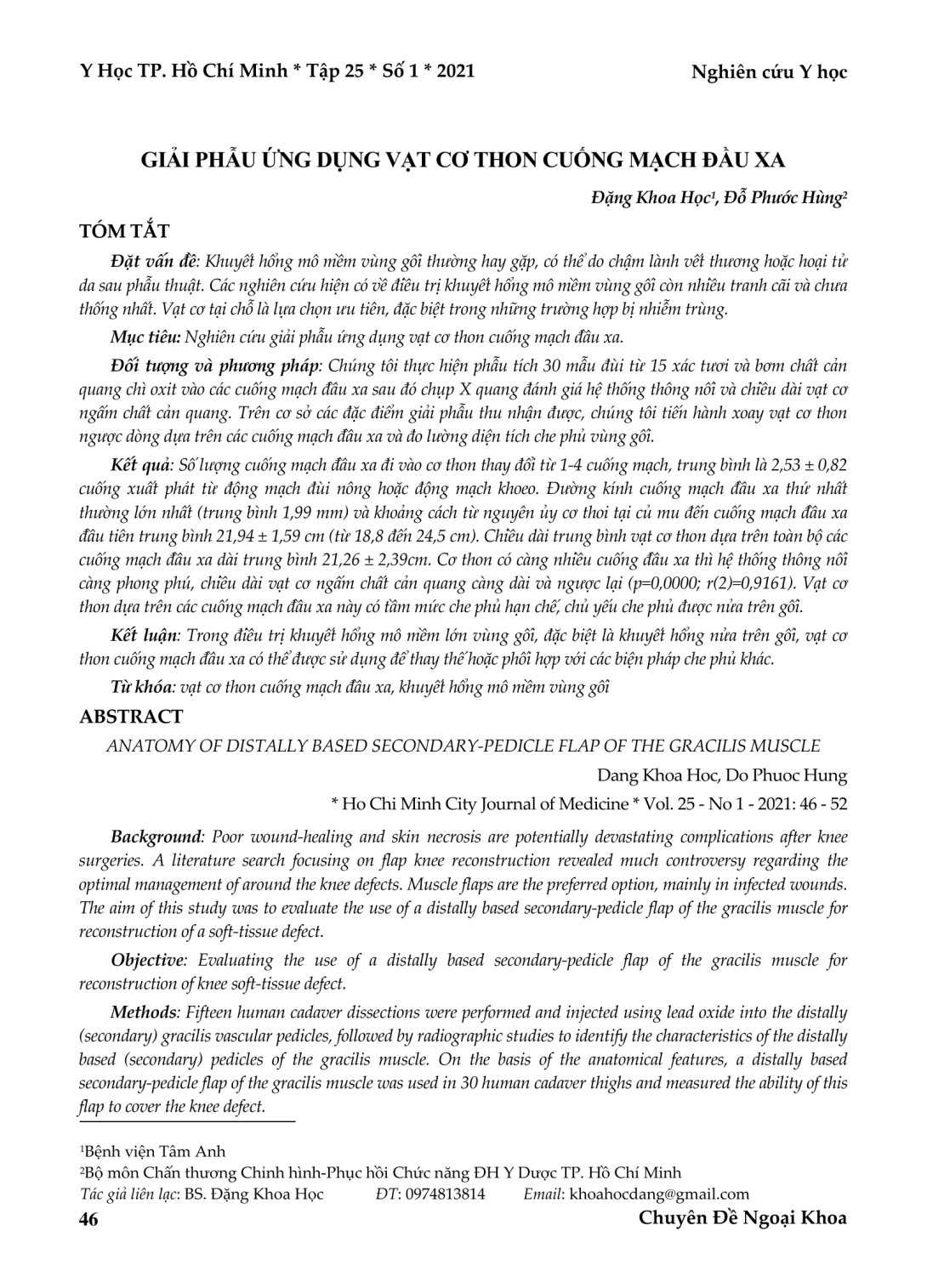 Nghiên cứu giải phẫu ứng dụng vạt cơ thon cuống mạch đầu xa. Thực hiện phẫu tích 30 mẫu đùi từ 15 xác tươi và bơm chất cản quang chì oxit vào các cuống mạch đầu xa sau đó chụp X quang đánh giá hệ thống thông nối và chiều dài vạt cơ ngấm chất cản quang. Trên cơ sở các đặc điểm giải phẫu thu nhận được, chúng tôi tiến hành xoay vạt cơ thon ngược dòng dựa trên các cuống mạch đầu xa và đo lường diện tích che phủ vùng gối. Kết quả: Số lượng cuống mạch đầu xa đi vào cơ thon thay đổi từ 1-4 cuống mạch, trung bình là 2,53 ± 0,82 cuống xuất phát từ động mạch đùi nông hoặc động mạch khoeo. Đường kính cuống mạch đầu xa thứ nhất thường lớn nhất (trung bình 1,99 mm) và khoảng cách từ nguyên ủy cơ thoi tại củ mu đến cuống mạch đầu xa đầu tiên trung bình 21,94 ± 1,59 cm (từ 18,8 đến 24,5 cm). Chiều dài trung bình vạt cơ thon dựa trên toàn bộ các cuống mạch đầu xa dài trung bình 21,26 ± 2,39cm. Cơ thon có càng nhiều cuống đầu xa thì hệ thống thông nối càng phong phú, chiều dài vạt cơ ngấm chất cản quang càng dài và ngược lại (p=0,0000; r(2)=0,9161). Vạt cơ thon dựa trên các cuống mạch đầu xa này có tầm mức che phủ hạn chế, chủ yếu che phủ được nửa trên gối. Kết luận: Trong điều trị khuyết hổng mô mềm lớn vùng gối, đặc biệt là khuyết hổng nửa trên gối, vạt cơ thon cuống mạch đầu xa có thể được sử dụng để thay thế hoặc phối hợp với các biện pháp che phủ khác.