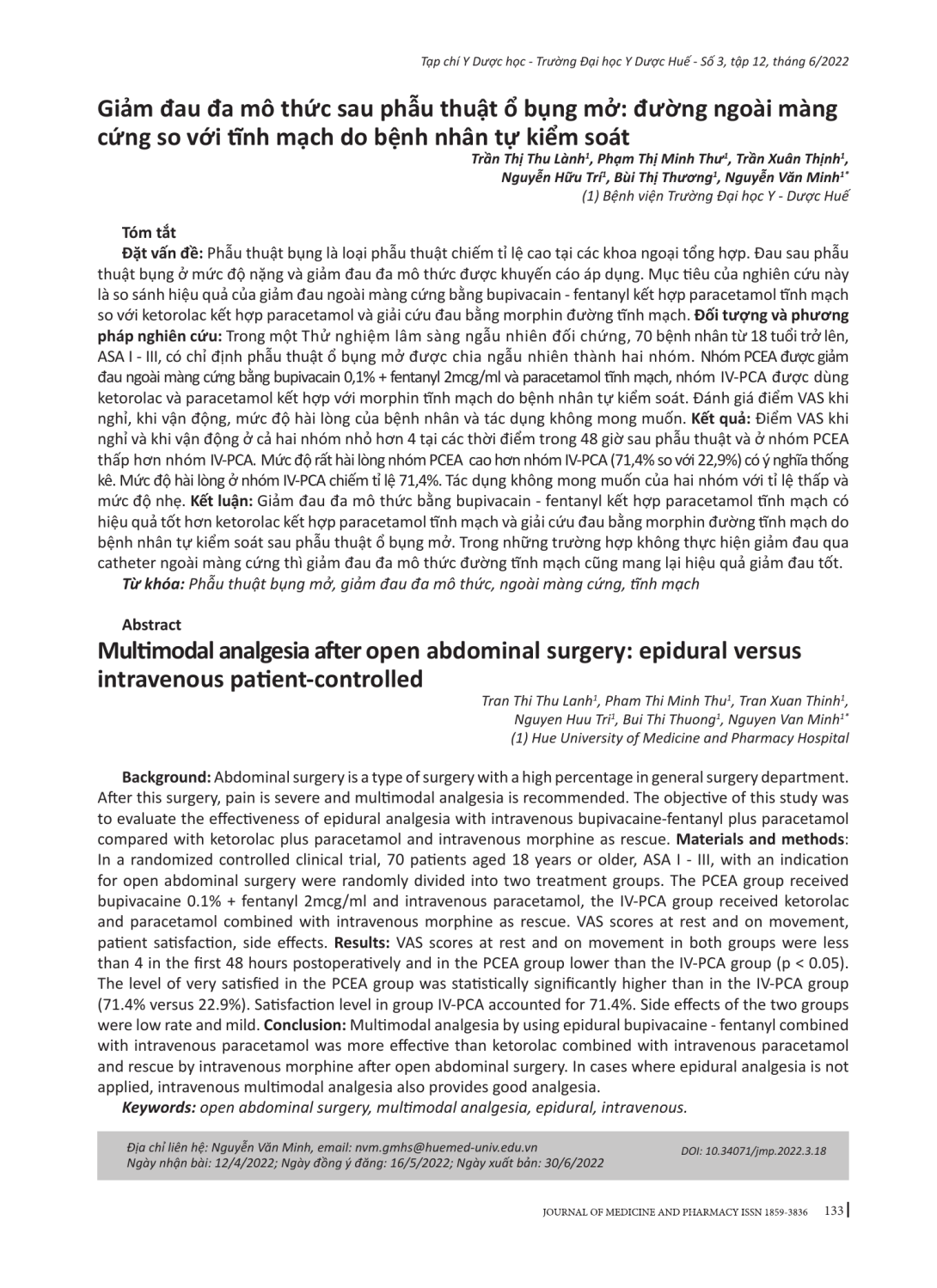 So sánh hiệu quả của giảm đau ngoài màng cứng bằng bupivacain - fentanyl kết hợp paracetamol tĩnh mạch so với ketorolac kết hợp paracetamol và giải cứu đau bằng morphin đường tĩnh mạch. Đối tượng và phương pháp nghiên cứu: Trong một Thử nghiệm lâm sàng ngẫu nhiên đối chứng, 70 bệnh nhân từ 18 tuổi trở lên, ASA I - III, có chỉ định phẫu thuật ổ bụng mở được chia ngẫu nhiên thành hai nhóm. Nhóm PCEA được giảm đau ngoài màng cứng bằng bupivacain 0,1% + fentanyl 2mcg/ml và paracetamol tĩnh mạch, nhóm IV-PCA được dùng ketorolac và paracetamol kết hợp với morphin tĩnh mạch do bệnh nhân tự kiểm soát. Đánh giá điểm VAS khi nghỉ, khi vận động, mức độ hài lòng của bệnh nhân và tác dụng không mong muốn. Kết quả: Điểm VAS khi nghỉ và khi vận động ở cả hai nhóm nhỏ hơn 4 tại các thời điểm trong 48 giờ sau phẫu thuật và ở nhóm PCEA thấp hơn nhóm IV-PCA. Mức độ rất hài lòng nhóm PCEA cao hơn nhóm IV-PCA (71,4% so với 22,9%) có ý nghĩa thống kê. Mức độ hài lòng ở nhóm IV-PCA chiếm tỉ lệ 71,4%. Tác dụng không mong muốn của hai nhóm với tỉ lệ thấp và mức độ nhẹ. Kết luận: Giảm đau đa mô thức bằng bupivacain - fentanyl kết hợp paracetamol tĩnh mạch có hiệu quả tốt hơn ketorolac kết hợp paracetamol tĩnh mạch và giải cứu đau bằng morphin đường tĩnh mạch do bệnh nhân tự kiểm soát sau phẫu thuật ổ bụng mở. Trong những trường hợp không thực hiện giảm đau qua catheter ngoài màng cứng thì giảm đau đa mô thức đường tĩnh mạch cũng mang lại hiệu quả giảm đau tốt.