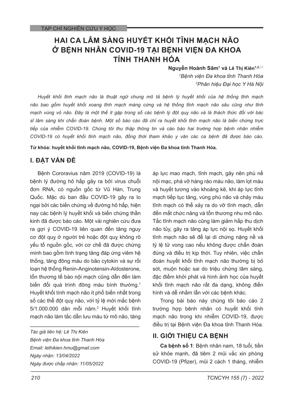 Huyết khối tĩnh mạch não là thuật ngữ chung mô tả bệnh lý huyết khối của hệ thống tĩnh mạch não bao gồm huyết khối xoang tĩnh mạch màng cứng và hệ thống tĩnh mạch não sâu cũng như tĩnh mạch vùng vỏ não. Đây là một thể ít gặp trong số các bệnh lý đột quỵ não và là thách thức đối với bác sĩ lâm sàng khi chẩn đoán bệnh. Một số báo cáo đã chỉ ra huyết khối tĩnh mạch não là biến chứng trực tiếp của nhiễm COVID-19. Chúng tôi thu thập thông tin và cáo báo hai trường hợp bệnh nhân nhiễm COVID-19 có huyết khối tĩnh mạch não, đồng thời tham khảo y văn các ca bệnh đã được báo cáo.