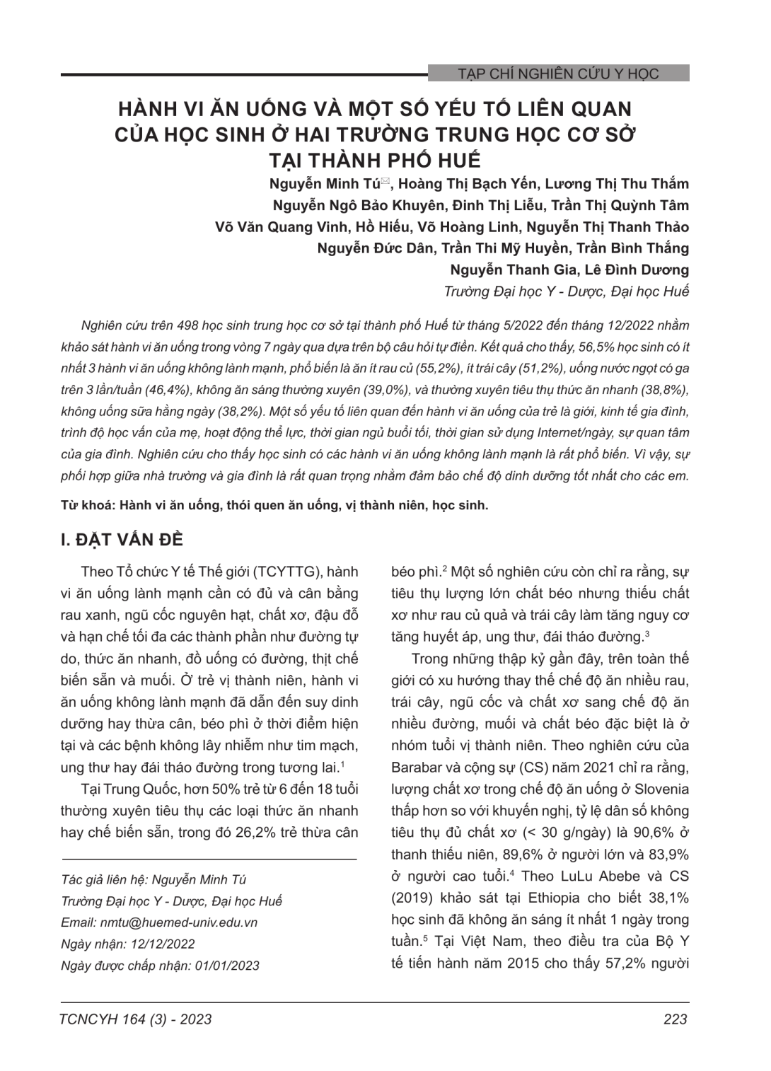 Nghiên cứu trên 498 học sinh trung học cơ sở tại thành phố Huế từ tháng 5/2022 đến tháng 12/2022 nhằm khảo sát hành vi ăn uống trong vòng 7 ngày qua dựa trên bộ câu hỏi tự điền. Kết quả cho thấy, 56,5% học sinh có ít nhất 3 hành vi ăn uống không lành mạnh, phổ biến là ăn ít rau củ (55,2%), ít trái cây (51,2%), uống nước ngọt có ga trên 3 lần/tuần (46,4%), không ăn sáng thường xuyên (39,0%), và thường xuyên tiêu thụ thức ăn nhanh (38,8%), không uống sữa hằng ngày (38,2%). Một số yếu tố liên quan đến hành vi ăn uống của trẻ là giới, kinh tế gia đình, trình độ học vấn của mẹ, hoạt động thể lực, thời gian ngủ buổi tối, thời gian sử dụng Internet/ngày, sự quan tâm của gia đình. Nghiên cứu cho thấy học sinh có các hành vi ăn uống không lành mạnh là rất phổ biến. Vì vậy, sự phối hợp giữa nhà trường và gia đình là rất quan trọng nhằm đảm bảo chế độ dinh dưỡng tốt nhất cho các em.
