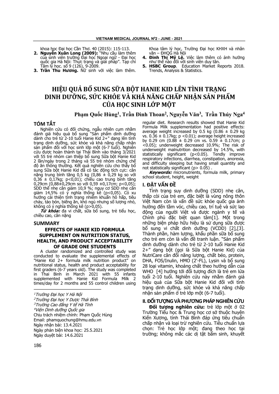 Nghiên cứu có đối chứng, ngẫu nhiên cụm nhằm đánh giá hiệu quả bổ sung “Sản phẩm dinh dưỡng dành cho trẻ từ 2-10 tuổi Hanie Kid 2+" dạng lên tình trạng dinh dưỡng, sức khỏe và khả năng chấp nhận sản phẩm đối với học sinh lớp một (6-7 tuổi). Nghiên cứu được hoàn thành tại Thái Bình vào tháng 3/2021 với 55 trẻ nhóm can thiệp bổ sung Sữa bột Hanie Kid 2 lần/ngày trong 2 tháng và 55 trẻ nhóm chứng chế độ ăn thông thường. Kết quả nghiên cứu cho thấy bổ sung Sữa bột Hanie Kid đã có tác động tích cực: cân nặng trung bình tăng 0,5 kg (0,86 ± 0,29 kg so với 0,36 ± 0,17kg; p<0,01); chiều cao trung bình tăng 0,29cm (0,88±0,29cm so với 0,59 ±0,17cm; p<0,05); SDD thể nhẹ cân giảm 10,9 %; nguy cơ SDD nhẹ cân giảm 14,5% có ý nghĩa thống kê (p<0,05). Có xu hướng cải thiện tình trạng nhiễm khuẩn hô hấp, tiêu chảy, táo bón, biếng ăn, khó ngủ nhưng số lượng nhỏ, không có ý nghĩa thống kê (p>0,05).