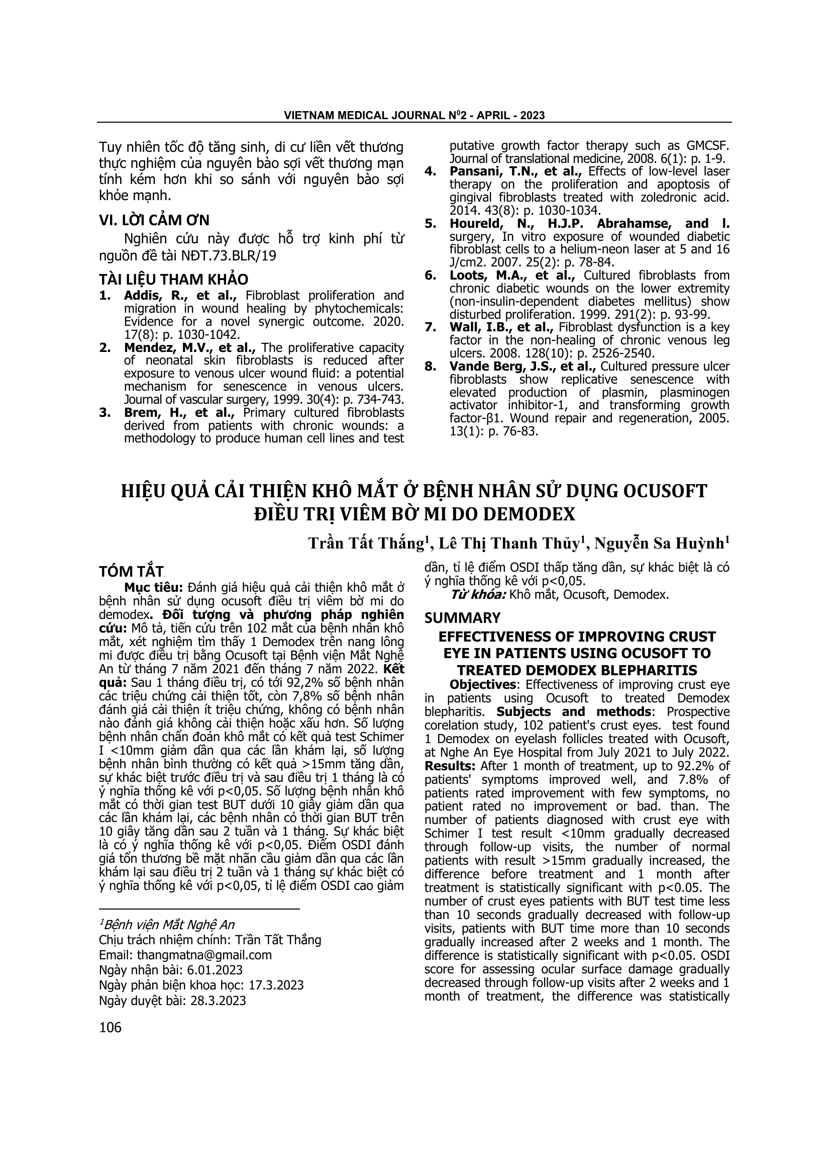 Đánh giá hiệu quả cải thiện khô mắt ở bệnh nhân sử dụng ocusoft điều trị viêm bờ mi do demodex. Đối tượng và phương pháp nghiên cứu: Mô tả, tiến cứu trên 102 mắt của bệnh nhân khô mắt, xét nghiệm tìm thấy 1 Demodex trên nang lông mi được điều trị bằng Ocusoft tại Bệnh viện Mắt Nghệ An từ tháng 7 năm 2021 đến tháng 7 năm 2022. Kết quả: Sau 1 tháng điều trị, có tới 92,2% số bệnh nhân các triệu chứng cải thiện tốt, còn 7,8% số bệnh nhân đánh giá cải thiện ít triệu chứng, không có bệnh nhân nào đánh giá không cải thiện hoặc xấu hơn. Số lượng bệnh nhân chẩn đoán khô mắt có kết quả test Schimer I <10mm giảm dần qua các lần khám lại, số lượng bệnh nhân bình thường có kết quả >15mm tăng dần, sự khác biệt trước điều trị và sau điều trị 1 tháng là có ý nghĩa thống kê với p<0,05. Số lượng bệnh nhân khô mắt có thời gian test BUT dưới 10 giây giảm dần qua các lần khám lại, các bệnh nhân có thời gian BUT trên 10 giây tăng dần sau 2 tuần và 1 tháng. Sự khác biệt là có ý nghĩa thống kê với p<0,05. Điểm OSDI đánh giá tổn thương bề mặt nhãn cầu giảm dần qua các lần khám lại sau điều trị 2 tuần và 1 tháng sự khác biệt có ý nghĩa thống kê với p<0,05, tỉ lệ điểm OSDI cao giảm dần, tỉ lệ điểm OSDI thấp tăng dần, sự khác biệt là có ý nghĩa thống kê với p<0,05
