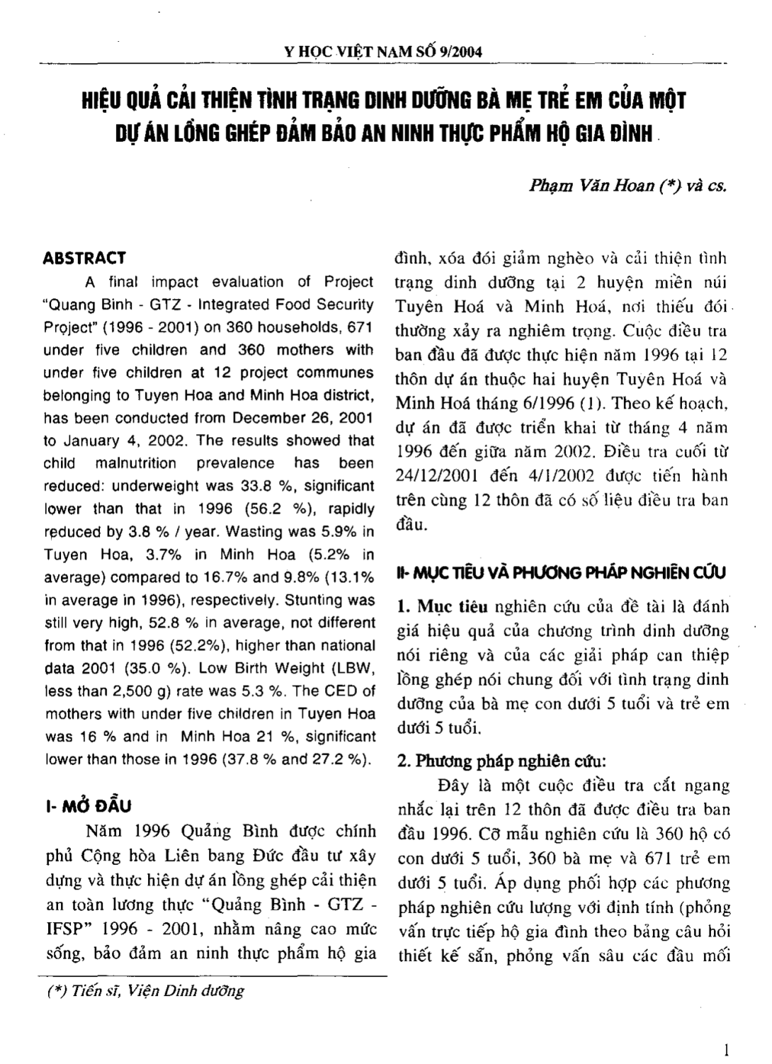 Hiệu quả cải thiện tình trạng dinh dưỡng bà mẹ trẻ em của một dự án lồng ghép đảm bảo an ninh thực phẩm hộ gia đình
