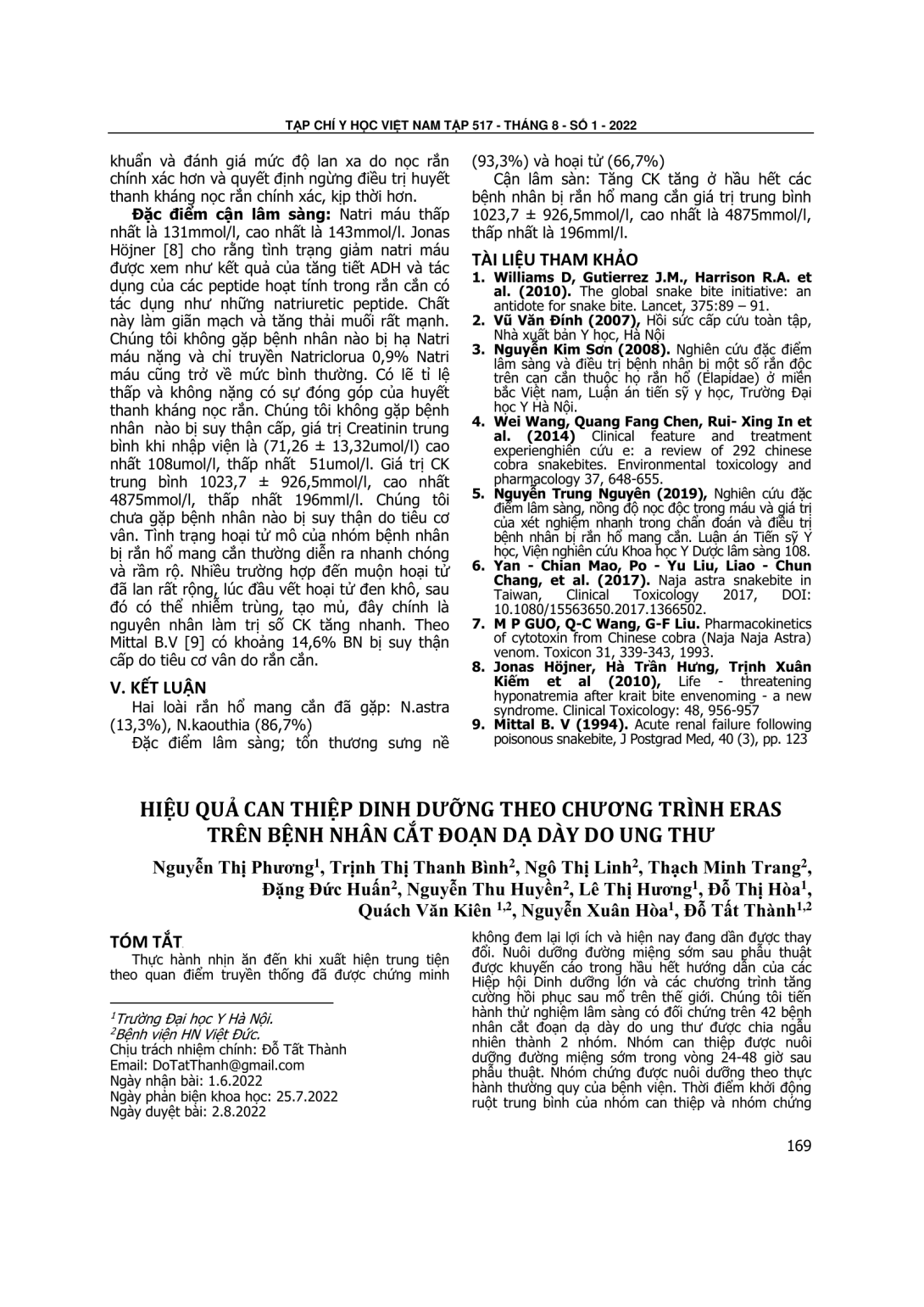 Thực hành nhịn ăn đến khi xuất hiện trung tiện theo quan điểm truyền thống đã được chứng minh không đem lại lợi ích và hiện nay đang dần được thay đổi. Nuôi dưỡng đường miệng sớm sau phẫu thuật được khuyến cáo trong hầu hết hướng dẫn của các Hiệp hội Dinh dưỡng lớn và các chương trình tăng cường hồi phục sau mổ trên thế giới. Chúng tôi tiến hành thử nghiệm lâm sàng có đối chứng trên 42 bệnh nhân cắt đoạn dạ dày do ung thư được chia ngẫu nhiên thành 2 nhóm. Nhóm can thiệp được nuôi dưỡng đường miệng sớm trong vòng 24-48 giờ sau phẫu thuật. Nhóm chứng được nuôi dưỡng theo thực hành thường quy của bệnh viện. Thời điểm khởi động ruột trung bình của nhóm can thiệp và nhóm chứng lần lượt là 35,4±27,9 giờ và 91,5± 29,9 giờ. Kết quả cho thấy nuôi dưỡng đường miệng sớm thúc đẩy sự phục hồi chức năng ruột: Thời điểm xuất hiện nhu động ruột (27,7±14,6 và 39,6±12,7 giờ; p=0,008 ) và trung tiện (51,0 ± 4,9 và 76,6±7,0 giờ) sớm hơn có ý nghĩa thống kê ở nhóm can thiệp so với nhóm chứng (p=0,008 và p=0,0047). Tỷ lệ các triệu chứng tiêu hóa(27,3% và 36,4%) và biến chứng sau phẫu thuật (4,5% và 4,5%), giữa 2 nhóm không có sự khác biệt có ý nghĩa thống kê, không ghi nhận trường hợp nào có rò bục miệng nối. Ngoài ra, nồng độ Prealbumin máu được cải thiện có ý nghĩa thống kê ở nhóm can thiệp (22,5 ± 0,62 và 16,5 ± 0,71 g/l; p=0,0021).