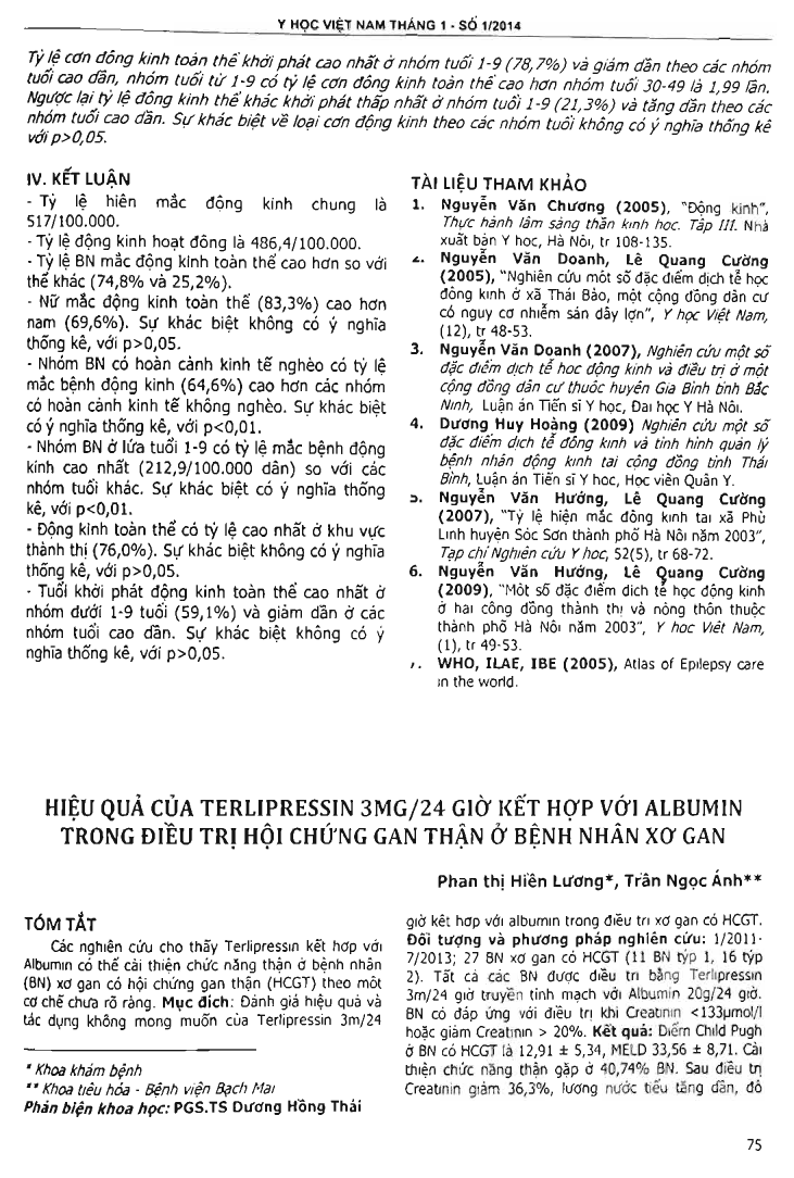 The vasopressin analogue terlipressin has been associated with improved renal fuction in patients with HRS, its effect on survival is unknown. Aim: To evaluate the effectiveness of an infusion of terlipressin plus albumin in revesing HRS, its tolerability, its adverse effects. Methods: 1/2011-7/2013, 27 consecutive patients with cirrhosis patients and HRS were indude in the study (11 patients typ 1, 16 patients typ 2). All patient received Terlipressin by continous IV at the dose 3mg/24 h plus albumin (20g/24h) as treatment for HRS. Response to treatment were defined by decrease in serum creatinin 133umol/l or decrease in pretreatment peak serum creatinin20 percent at the end treatment. Results: At inclusion, the Child Pugh score was 12,91 + or - 5,34, MELD 33,56 + or - 8,71. Renal function improved in 40,74 percent of patients. After treatment, serum creatinin decreased by 36,3 percent, urin output significantly increase progrressively, Creatinin clearance improve in response groups. Median survival time was 101 days for responses groups, 8,2 days for non responses groups. Survival rate was 37,04 percent at month, 22,2 percent at 2 months. Conclusion: The study shows that in patients with HRS terlipressin induced improved renal function is associated with an increase in survival.