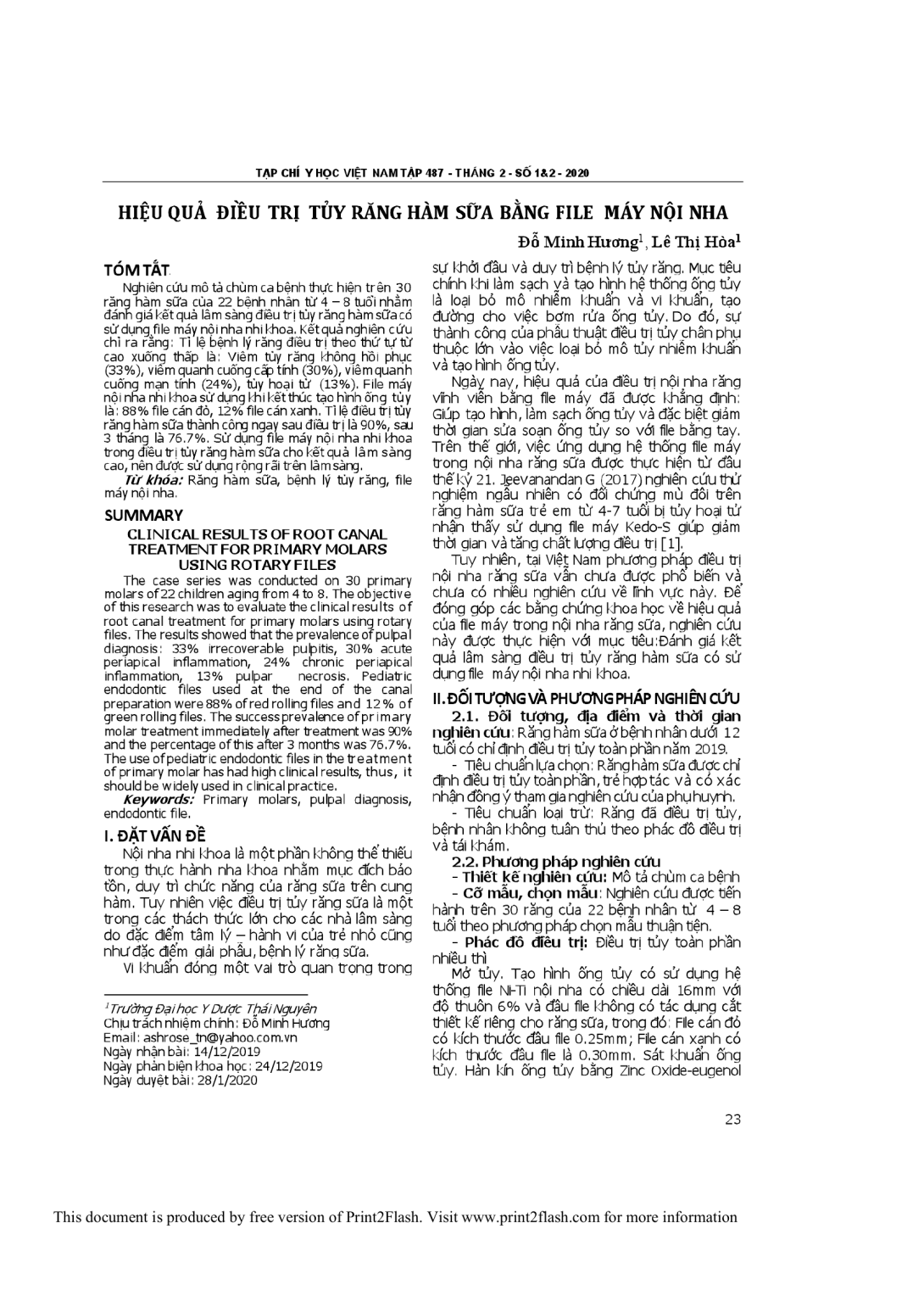 Nghiên cứu mô tả chùm ca bệnh thực hiện trên 30 răng hàm sữa của 22 bệnh nhân từ 4 – 8 tuổi nhằm đánh giá kết quả lâm sàng điều trị tủy răng hàm sữa có sử dụng file máy nội nha nhi khoa. Kết quả nghiên cứu chỉ ra rằng Tỉ lệ bệnh lý răng điều trị theo thứ tự từ cao xuống thấp là Viêm tủy răng không hồi phục (33%), viêm quanh cuống cấp tính (30%), viêm quanh cuống mạn tính (24%), tủy hoại tử (13%). File máy nội nha nhi khoa sử dụng khi kết thúc tạo hình ống tủy là 88% file cán đỏ, 12% file cán xanh. Tỉ lệ điều trị tủy răng hàm sữa thành công ngay sau điều trị là 90%, sau 3 tháng là 76.7%. Sử dụng file máy nội nha nhi khoa trong điều trị tủy răng hàm sữa cho kết quả lâm sàng cao, nên được sử dụng rộng rãi trên lâm sàng.