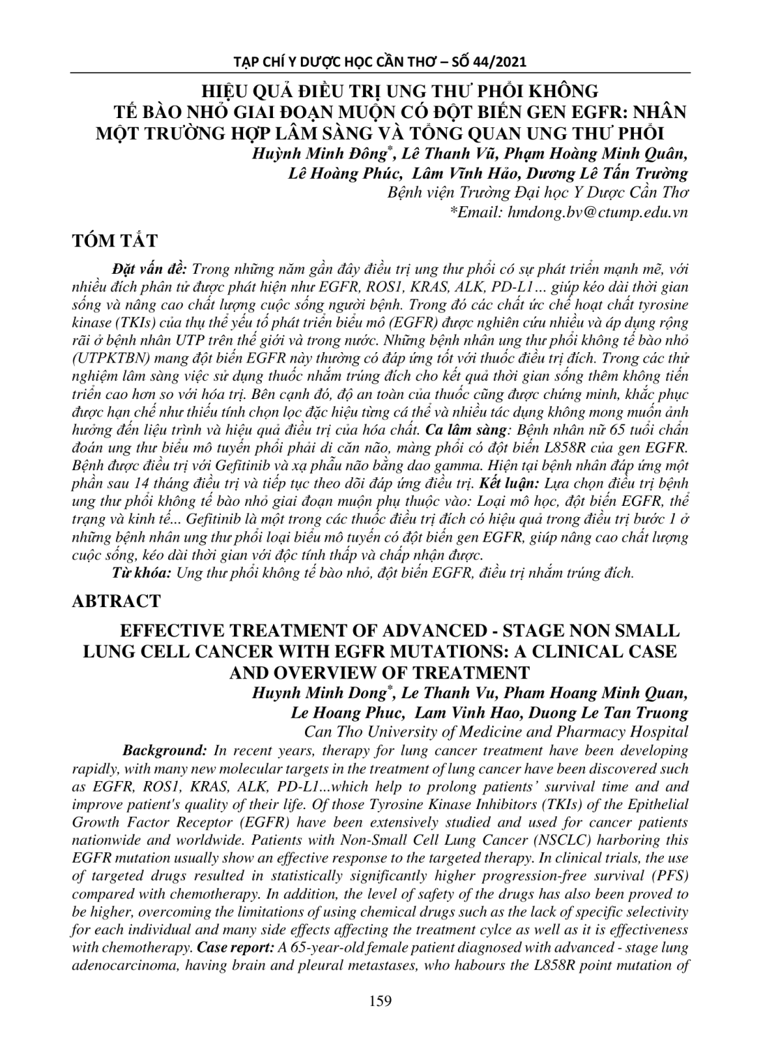 Trong những năm gần đây điều trị ung thư phổi có sự phát triển mạnh mẽ, với nhiều đích phân tử được phát hiện như EGFR, ROS1, KRAS, ALK, PD-L1… giúp kéo dài thời gian sống và nâng cao chất lượng cuộc sống người bệnh. Trong đó các chất ức chế hoạt chất tyrosine kinase (TKIs) của thụ thể yếu tố phát triển biểu mô (EGFR) được nghiên cứu nhiều và áp dụng rộng rãi ở bệnh nhân UTP trên thế giới và trong nước. Những bệnh nhân ung thư phổi không tế bào nhỏ (UTPKTBN) mang đột biến EGFR này thường có đáp ứng tốt với thuốc điều trị đích. Trong các thử nghiệm lâm sàng việc sử dụng thuốc nhắm trúng đích cho kết quả thời gian sống thêm không tiến triển cao hơn so với hóa trị. Bên cạnh đó, độ an toàn của thuốc cũng được chứng minh, khắc phục được hạn chế như thiếu tính chọn lọc đặc hiệu từng cá thể và nhiều tác dụng không mong muốn ảnh hưởng đến liệu trình và hiệu quả điều trị của hóa chất. Ca lâm sàng: Bệnh nhân nữ 65 tuổi chẩn đoán ung thư biểu mô tuyến phổi phải di căn não, màng phổi có đột biến L858R của gen EGFR. Bệnh được điều trị với Gefitinib và xạ phẫu não bằng dao gamma. Hiện tại bệnh nhân đáp ứng một phần sau 14 tháng điều trị và tiếp tục theo dõi đáp ứng điều trị. Kết luận: Lựa chọn điều trị bệnh ung thư phổi không tế bào nhỏ giai đoạn muộn phụ thuộc vào: Loại mô học, đột biến EGFR, thể trạng và kinh tế... Gefitinib là một trong các thuốc điều trị đích có hiệu quả trong điều trị bước 1 ở những bệnh nhân ung thư phổi loại biểu mô tuyến có đột biến gen EGFR, giúp nâng cao chất lượng cuộc sống, kéo dài thời gian với độc tính thấp và chấp nhận được.