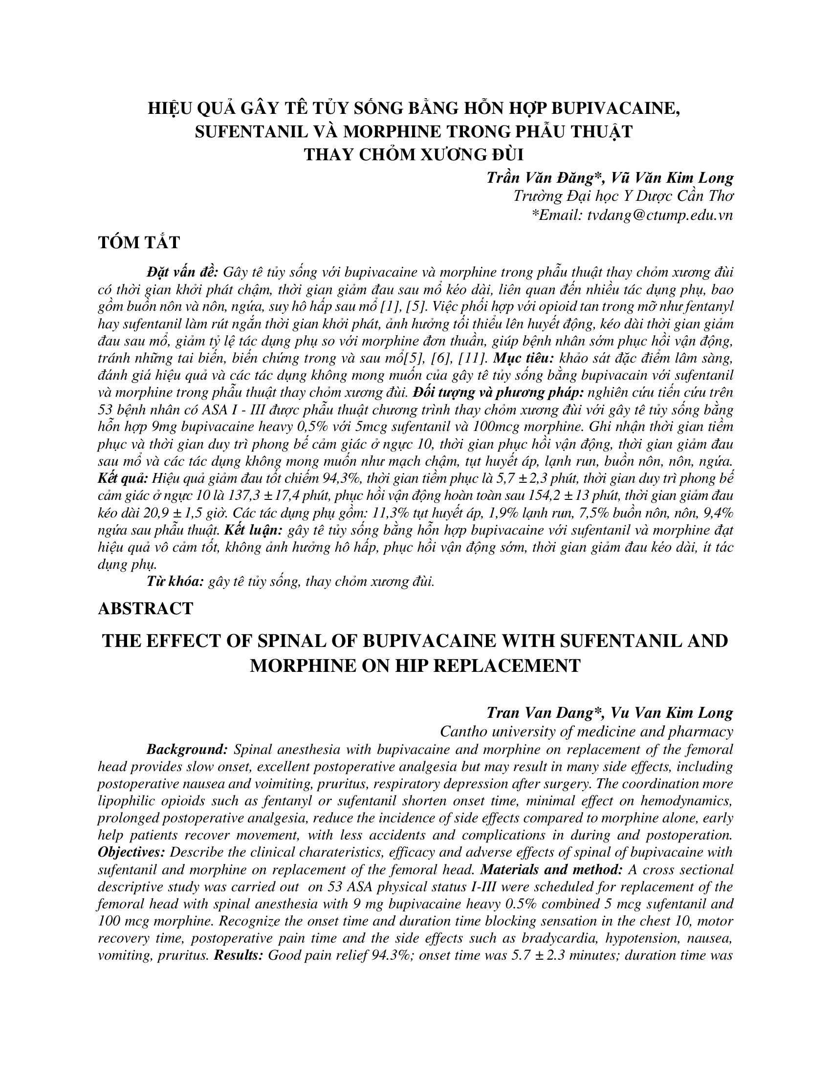 Khảo sát đặc điểm lâm sàng, đánh giá hiệu quả và các tác dụng không mong muốn của gây tê tủy sống bằng bupivacain với sufentanil và morphine trong phẫu thuật thay chỏm xương đùi. Nghiên cứu tiến cứu trên 53 bệnh nhân có ASA I - III được phẫu thuật chương trình thay chỏm xương đùi với gây tê tủy sống bằng hỗn hợp 9mg bupivacaine heavy 0,5% với 5mcg sufentanil và 100mcg morphine. Ghi nhận thời gian tiềm phục và thời gian duy trì phong bế cảm giác ở ngực 10, thời gian phục hồi vận động, thời gian giảm đau sau mổ và các tác dụng không mong muốn như mạch chậm, tụt huyết áp, lạnh run, buồn nôn, nôn, ngứa. Kết quả Hiệu quả giảm đau tốt chiếm 94,3%, thời gian tiềm phục là 5,7 ± 2,3 phút, thời gian duy trì phong bế cảm giác ở ngực 10 là 137,3 ± 17,4 phút, phục hồi vận động hoàn toàn sau 154,2 ± 13 phút, thời gian giảm đau kéo dài 20,9 ± 1,5 giờ. Các tác dụng phụ gồm 11,3% tụt huyết áp, 1,9% lạnh run, 7,5% buồn nôn, nôn, 9,4% ngứa sau phẫu thuật.