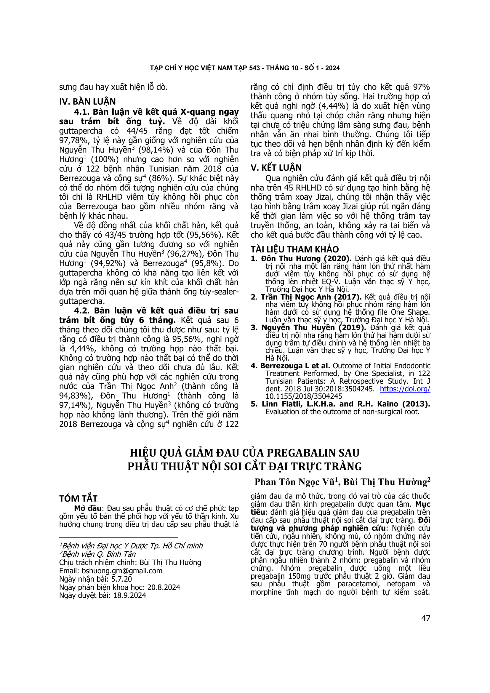 Đau sau phẫu thuật có cơ chế phức tạp gồm yếu tố bản thể phối hợp với yếu tố thần kinh. Xu hướng chung trong điều trị đau cấp sau phẫu thuật là giảm đau đa mô thức, trong đó vai trò của các thuốc giảm đau thần kinh pregabalin được quan tâm. Mục tiêu: đánh giá hiệu quả giảm đau của pregabalin trên đau cấp sau phẫu thuật nội soi cắt đại trực tràng. Đối tượng và phương pháp nghiên cứu: Nghiên cứu tiến cứu, ngẫu nhiên, không mù, có nhóm chứng này được thực hiện trên 70 người bệnh phẫu thuật nội soi cắt đại trực tràng chương trình. Người bệnh được phân ngẫu nhiên thành 2 nhóm: pregabalin và nhóm chứng. Nhóm pregabalin được uống một liều pregabalin 150mg trước phẫu thuật 2 giờ. Giảm đau sau phẫu thuật gồm paracetamol, nefopam và morphine tĩnh mạch do người bệnh tự kiểm soát. Lượng morphine tiêu thụ, điểm đau VAS khi nghỉ, khi vận động và các tác dụng không mong muốn trong 24 giờ đầu sau phẫu thuật được ghi nhận. Kết quả: Sau phẫu thuật nội soi cắt đại trực tràng, lượng morphine tiêu thụ ở nhóm pregabalin thấp hơn có ý nghĩa thống kê so với nhóm chứng (19,8 mg ± 2,6 mg và 22,1 mg ± 4,5 mg, p = 0,01). Không có sự khác biệt về điểm đau khi nghỉ, vận động và các tác dụng không mong muốn giữa 2 nhóm. Kết luận: Sử dụng pregabalin giúp giảm lượng morphine tiêu thụ sau phẫu thuật nội soi cắt đại trực tràng. Sử dụng pregabalin không giúp cải thiện điểm đau khi nghỉ cũng như khi vận động và không làm tăng các tác dụng không mong muốn.