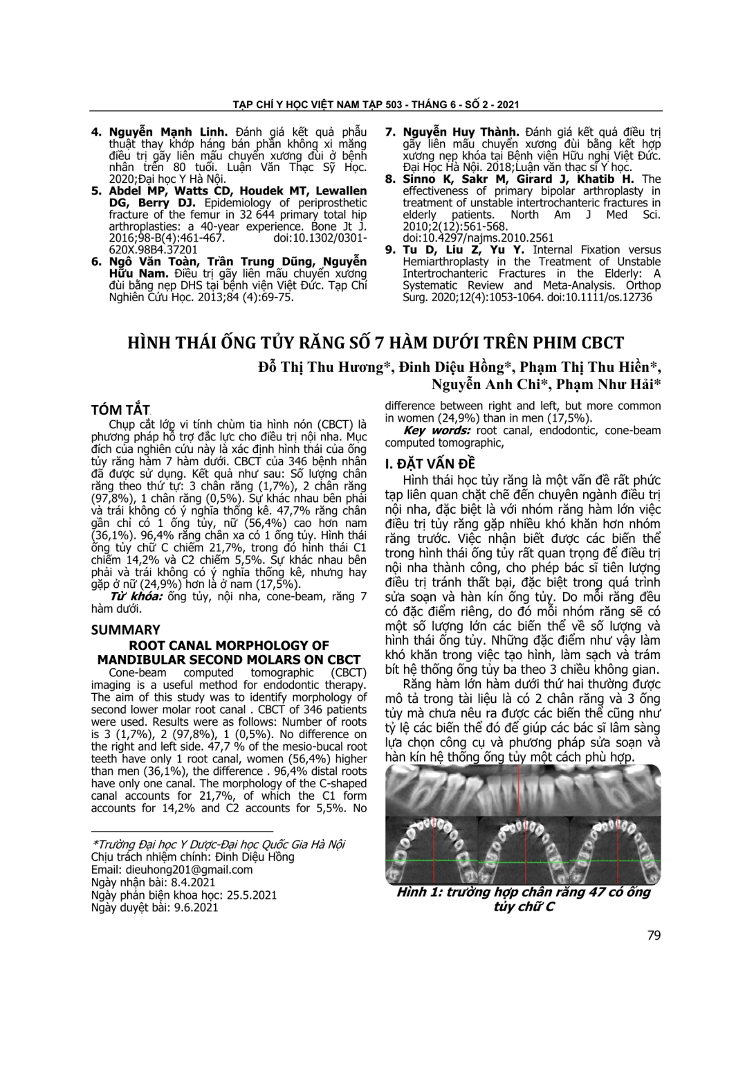 Chụp cắt lớp vi tính chùm tia hình nón (CBCT) là phương pháp hỗ trợ đắc lực cho điều trị nội nha. Mục đích của nghiên cứu này là xác định hình thái của ống tủy răng hàm 7 hàm dưới. CBCT của 346 bệnh nhân đã được sử dụng. Kết quả như sau: Số lượng chân răng theo thứ tự: 3 chân răng (1,7%), 2 chân răng (97,8%), 1 chân răng (0,5%). Sự khác nhau bên phải và trái không có ý nghĩa thống kê. 47,7% răng chân gần chỉ có 1 ống tủy, nữ (56,4%) cao hơn nam (36,1%). 96,4% răng chân xa có 1 ống tủy. Hình thái ống tủy chữ C chiếm 21,7%, trong đó hình thái C1 chiếm 14,2% và C2 chiếm 5,5%. Sự khác nhau bên phải và trái không có ý nghĩa thống kê, nhưng hay gặp ở nữ (24,9%) hơn là ở nam (17,5%).