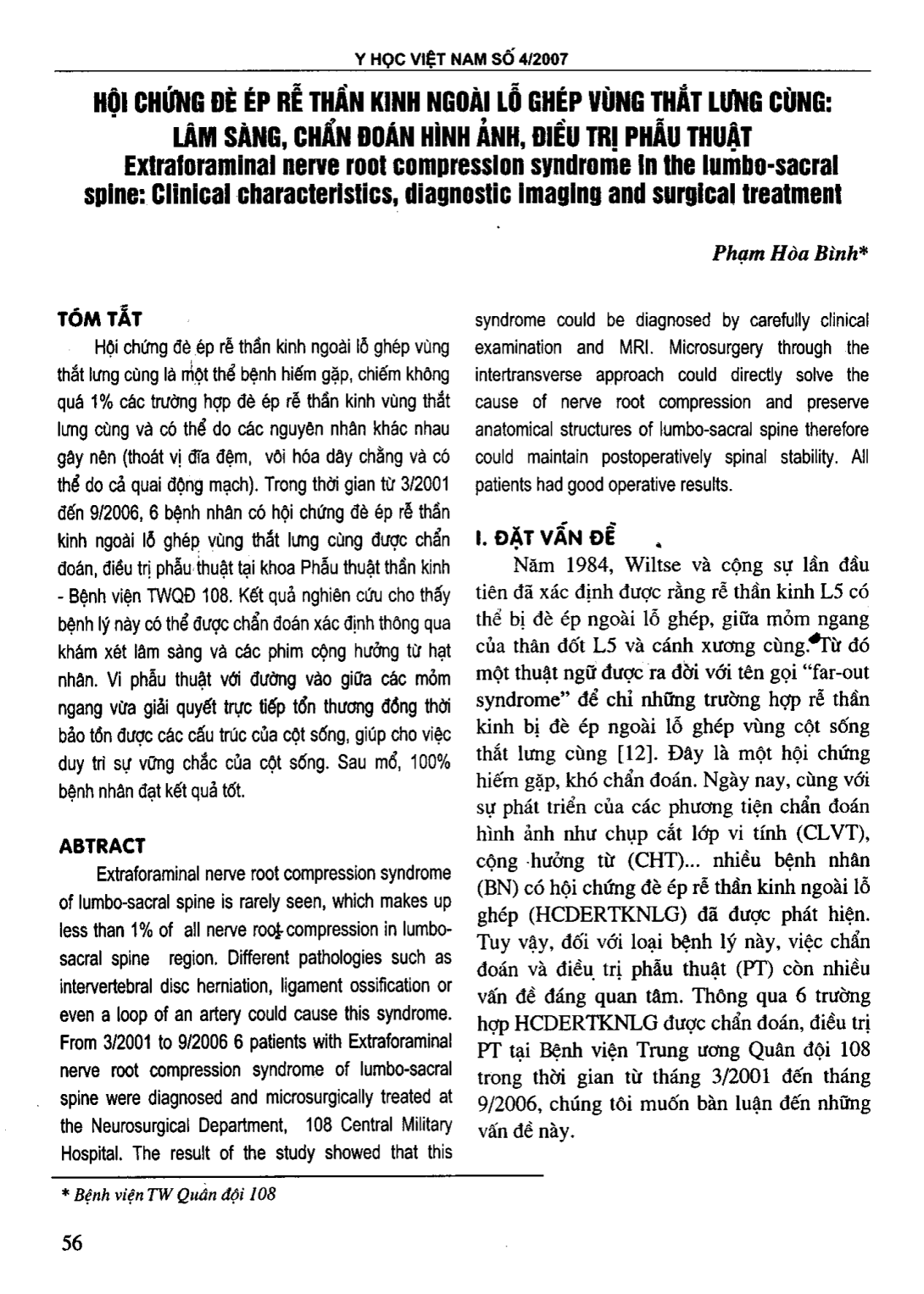 Hội chứng đè ép rễ thần kinh ngoài lỗ ghép vùng thắt lưng cùng: lâm sàng, chẩn đoán hình ảnh, điều trị Phẫu thuật