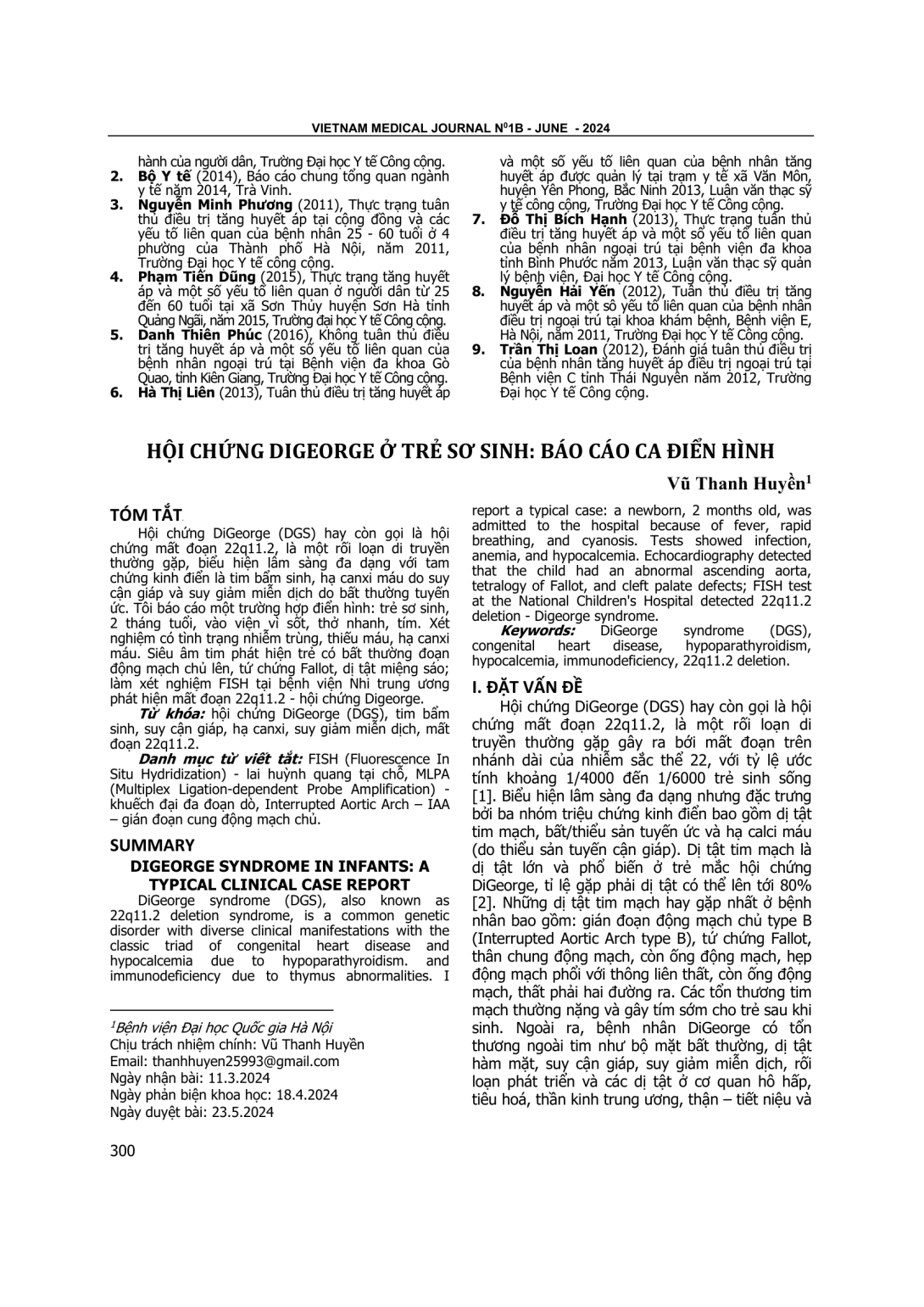 Hội chứng DiGeorge (DGS) hay còn gọi là hội chứng mất đoạn 22q11.2, là một rối loạn di truyền thường gặp, biểu hiện lâm sàng đa dạng với tam chứng kinh điển là tim bẩm sinh, hạ canxi máu do suy cận giáp và suy giảm miễn dịch do bất thường tuyến ức. Tôi báo cáo một trường hợp điển hình: trẻ sơ sinh, 2 tháng tuổi, vào viện vì sốt, thở nhanh, tím. Xét nghiệm có tình trạng nhiễm trùng, thiếu máu, hạ canxi máu. Siêu âm tim phát hiện trẻ có bất thường đoạn động mạch chủ lên, tứ chứng Fallot, dị tật miệng sáo; làm xét nghiệm FISH tại bệnh viện Nhi trung ương phát hiện mất đoạn 22q11.2 - hội chứng Digeorge.