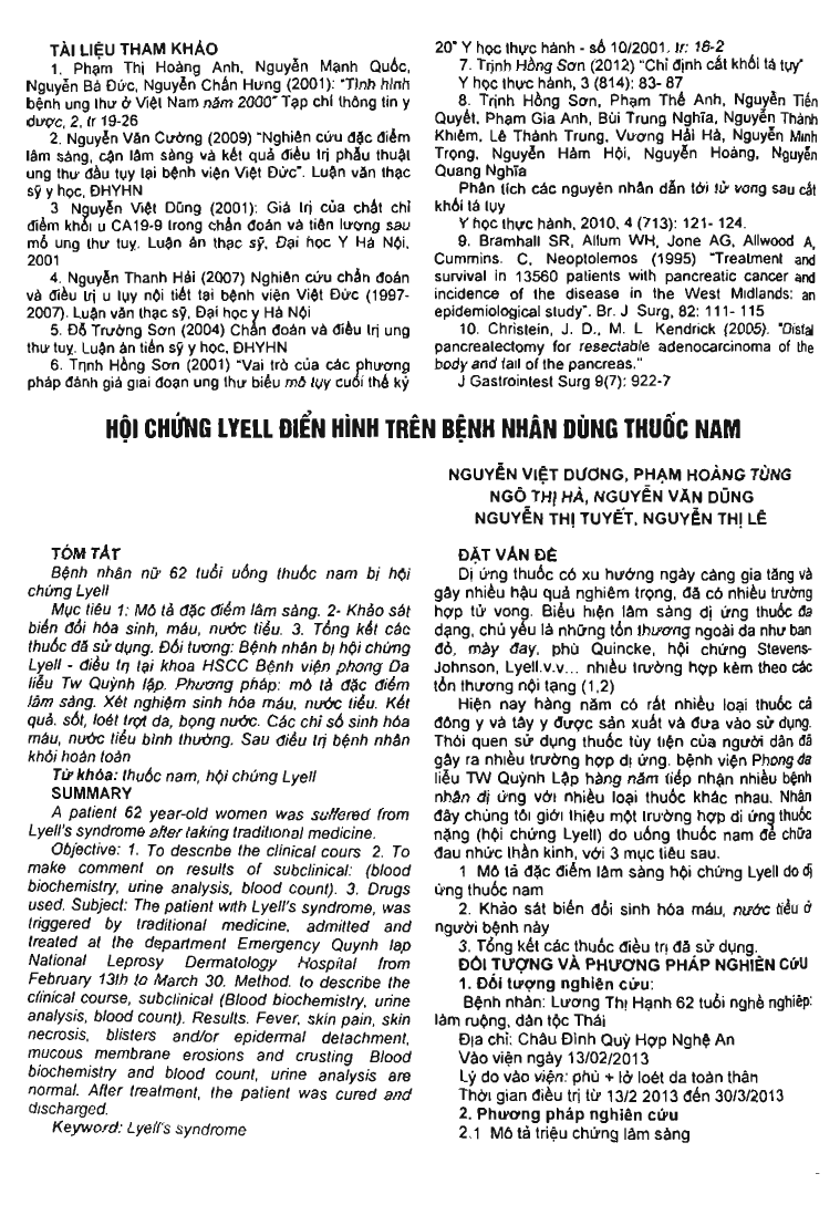 A patient 62 year-old women was suffered from Lyell's syndrome after taking traditional medicine. Objective: 1/ To describe the clinical cours. 2/ To make comment on results of subclinical: (blood biochemistry, urine analysis, blood count). 3/ Drugs used. Subject: The patient with Lyell's syndrome, was triggered by traditional medicine, admitted and treated at the department Emergency Quynh Lap National Leprosy Dermatology Hospital from February 13th to March 30. Method: to describe the clinical course, subclinical (Blood biochemistry, urine analysis, blood count). Results: Fever, skin pain, skin necrosis, blisters and/or epidermal detachment, mucous membrane erosions and crusting. Blood biochemistry and blood count, urine analysis are normal. After treatment, the patient was cured and discharged.