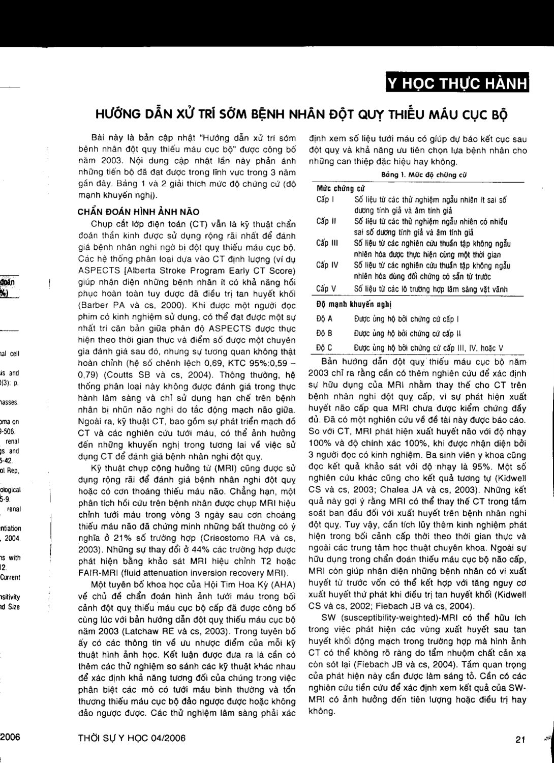 Bài viết là bản cập nhật "Hướng dẫn xử trí sớm bệnh nhân đột quỵ thiếu máu cục bộ" được công bố năm 2003. Nội dung cập nhật lần này phản ánh những tiến bộ đã đạt được trong lĩnh vực qua 3 năm gần đây.
