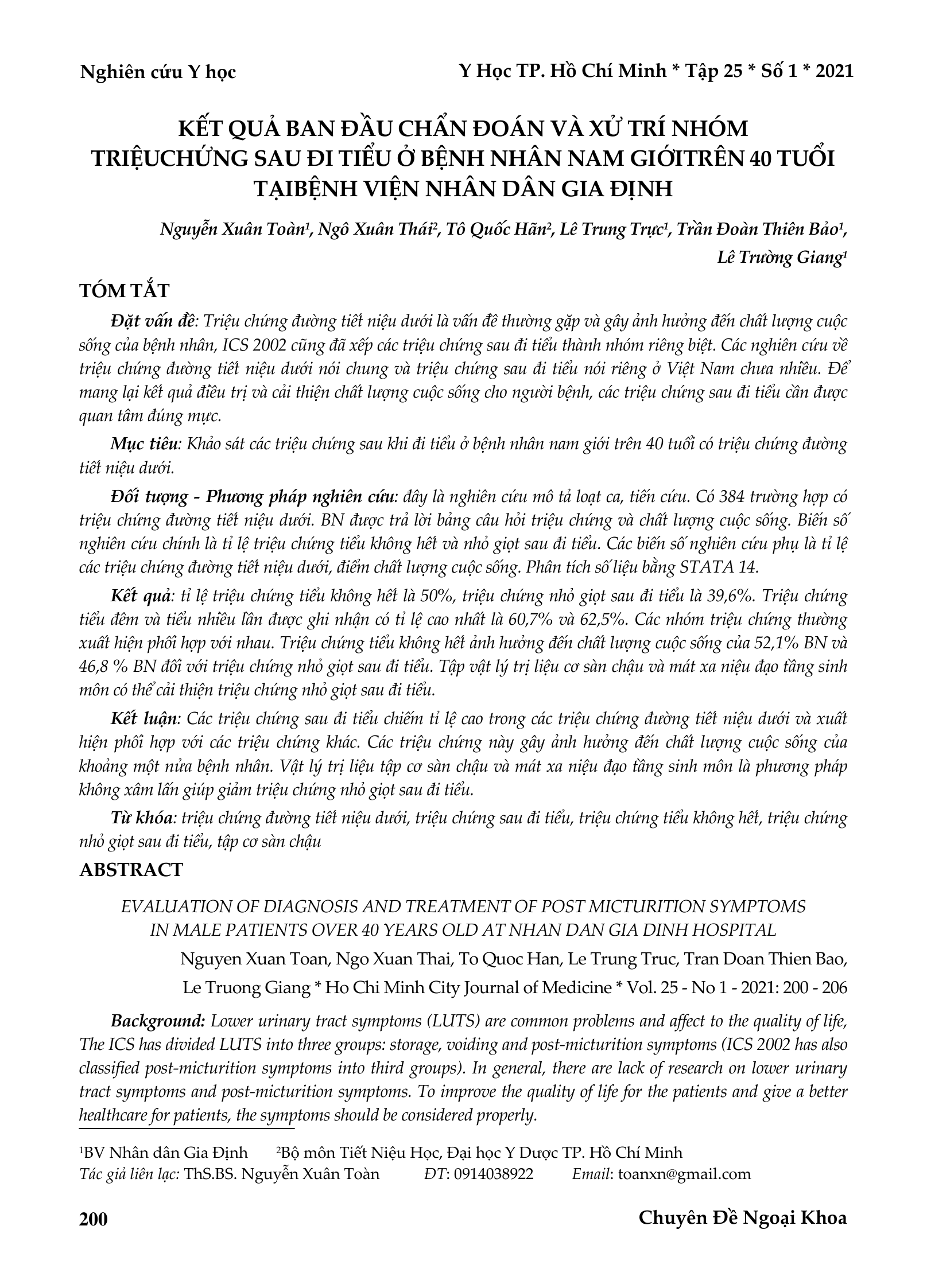 Khảo sát các triệu chứng sau khi đi tiểu ở bệnh nhân nam giới trên 40 tuổi có triệu chứng đường tiết niệu dưới. Đối tượng - Phương pháp nghiên cứu đây là nghiên cứu mô tả loạt ca, tiến cứu. Có 384 trường hợp có triệu chứng đường tiết niệu dưới. BN được trả lời bảng câu hỏi triệu chứng và chất lượng cuộc sống. Biến số nghiên cứu chính là tỉ lệ triệu chứng tiểu không hết và nhỏ giọt sau đi tiểu. Các biến số nghiên cứu phụ là tỉ lệ các triệu chứng đường tiết niệu dưới, điểm chất lượng cuộc sống. Phân tích số liệu bằng STATA 14. Kết quả tỉ lệ triệu chứng tiểu không hết là 50%, triệu chứng nhỏ giọt sau đi tiểu là 39,6%. Triệu chứng tiểu đêm và tiểu nhiều lần được ghi nhận có tỉ lệ cao nhất là 60,7% và 62,5%. Các nhóm triệu chứng thường xuất hiện phối hợp với nhau. Triệu chứng tiểu không hết ảnh hưởng đến chất lượng cuộc sống của 52,1% BN và 46,8 % BN đối với triệu chứng nhỏ giọt sau đi tiểu. Tập vật lý trị liệu cơ sàn chậu và mát xa niệu đạo tầng sinh môn có thể cải thiện triệu chứng nhỏ giọt sau đi tiểu. Kết luận Các triệu chứng sau đi tiểu chiếm tỉ lệ cao trong các triệu chứng đường tiết niệu dưới và xuất hiện phối hợp với các triệu chứng khác. Các triệu chứng này gây ảnh hưởng đến chất lượng cuộc sống của khoảng một nửa bệnh nhân. Vật lý trị liệu tập cơ sàn chậu và mát xa niệu đạo tầng sinh môn là phương pháp không xâm lấn giúp giảm triệu chứng nhỏ giọt sau đi tiểu.