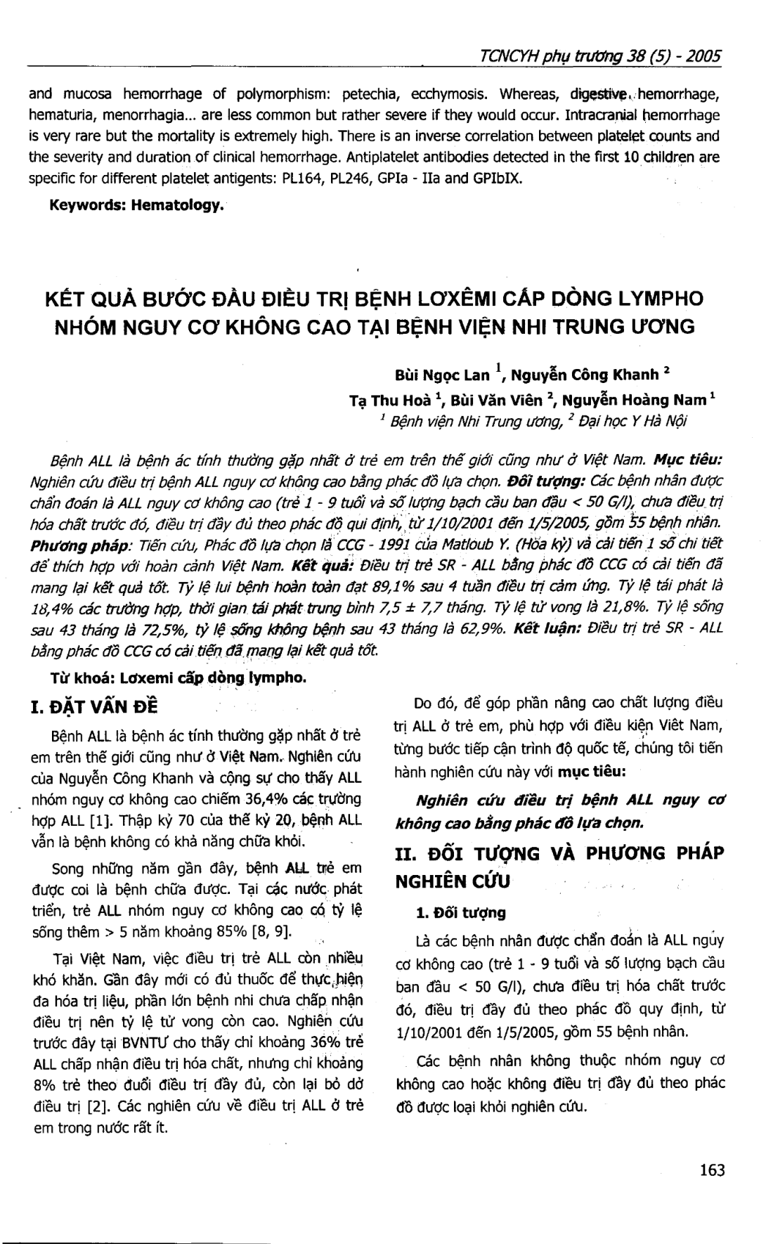 Kết quả bước đầu điều trị bệnh Lơxêmi cấp dòng Lympho nhóm nguy cơ không cao tại Bệnh viện Nhi trung ương
