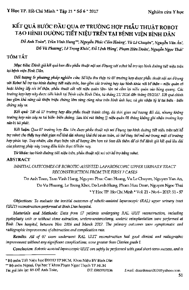 Đánh giá kết quả phẫu thuật nội soi ổ bụng với robot hỗ trợ tạo hình đường tiết niệu trên trên 7 trường hợp tại bệnh viện Bình Dân. Kết quả cho thấy tất cả 7 trường hợp đều phẫu thuật thành công, dù thời gian mổ tương đối dài nhưng không trường hợp nào xảy ra biến chứng. Sau khi rút thông JJ niệu quản 1 tháng không ghi nhận trường hợp nào tái phát.