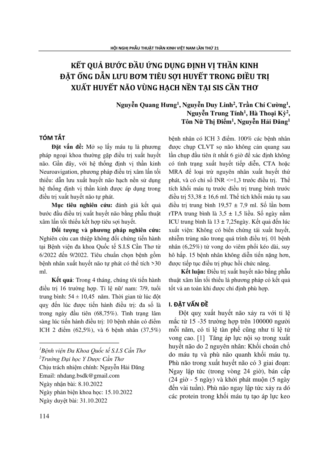 Đánh giá kết quả bước đầu điều trị xuất huyết não bằng phẫu thuật xâm lấn tối thiểu kết hợp tiêu sợi huyết. Đối tượng và phương pháp nghiên cứu: Nghiên cứu can thiệp không đối chứng tiến hành tại Bệnh viện đa khoa Quốc tế S.I.S Cần Thơ từ 6/2022 đến 9/2022. Tiêu chuẩn chọn bệnh gồm bệnh nhân xuất huyết não tự phát có thể tích >30 ml. Kết quả: Trong 4 tháng, chúng tôi tiến hành điều trị 16 trường hợp. Tỉ lệ nữ/ nam: 7/9, tuổi trung bình: 54 ± 10,45 năm. Thời gian từ lúc đột quỵ đến lúc được tiến hành điều trị: đa số là trong ngày đầu tiên (68,75%). Tình trạng lâm sàng lúc tiến hành điều trị: 10 bệnh nhân có điểm ICH 2 điểm (62,5%), và 6 bệnh nhân (37,5%) bệnh nhân có ICH 3 điểm. 100% các bệnh nhân được chụp CLVT sọ não không cản quang sau lần chụp đầu tiên ít nhất 6 giờ để xác định không có tình trạng xuất huyết tiếp diễn, CTA hoặc MRA để loại trừ nguyên nhân xuất huyết thứ phát, và có chỉ số INR <=1,3 trước điều trị. Thể tích khối máu tụ trước điều trị trung bình trước điều trị 53,38 ± 16,6 ml. Thể tích khối máu tụ sau điều trị trung bình 19,57 ± 7,9 ml. Số lần bơm rTPA trung bình là 3,5 ± 1,5 liều. Số ngày nằm ICU trung bình là 13 ± 7,25ngày. Kết quả đến lúc xuất viện: Không có biến chứng tái xuất huyết, nhiễm trùng não trong quá trình điều trị. 01 bệnh nhân (6,25%) tử vong do viêm phổi kéo dài, suy hô hấp. 15 bệnh nhân không diễn tiến nặng hơn, được tiếp tục điều trị phục hồi chức năng.