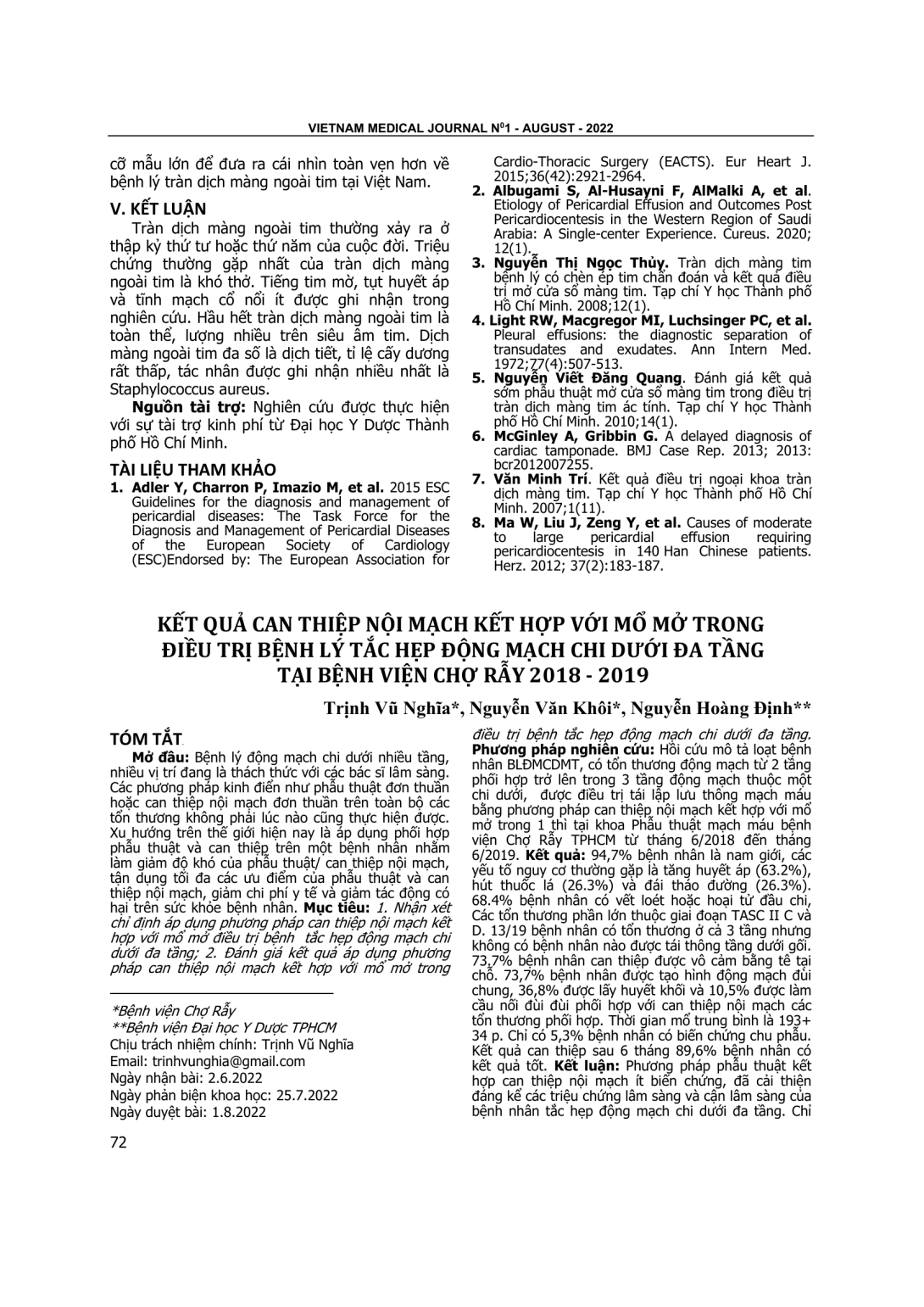 Nhận xét chỉ định áp dụng phương pháp can thiệp nội mạch kết hợp với mổ mở điều trị bệnh tắc hẹp động mạch chi dưới đa tầng. Đánh giá kết quả áp dụng phương pháp can thiệp nội mạch kết hợp với mổ mở trong điều trị bệnh tắc hẹp động mạch chi dưới đa tầng. Phương pháp nghiên cứu: Hồi cứu mô tả loạt bệnh nhân BLĐMCDMT, có tổn thương động mạch từ 2 tầng phối hợp trở lên trong 3 tầng động mạch thuộc một chi dưới, được điều trị tái lập lưu thông mạch máu bằng phương pháp can thiệp nội mạch kết hợp với mổ mở trong 1 thì tại khoa Phẫu thuật mạch máu bệnh viện Chợ Rẫy TPHCM từ tháng 6/2018 đến tháng 6/2019. Kết quả: 94,7% bệnh nhân là nam giới, các yếu tố nguy cơ thường gặp là tăng huyết áp (63.2%), hút thuốc lá (26.3%) và đái tháo đường (26.3%). 68.4% bệnh nhân có vết loét hoặc hoại tử đầu chi, Các tổn thương phần lớn thuộc giai đoạn TASC II C và D. 13/19 bệnh nhân có tổn thương ở cả 3 tầng nhưng không có bệnh nhân nào được tái thông tầng dưới gối. 73.7% bệnh nhân can thiệp được vô cảm bằng tê tại chỗ. 73,7% bệnh nhân được tạo hình động mạch đùi chung, 36,8% được lấy huyết khối và 10,5% được làm cầu nối đùi đùi phối hợp với can thiệp nội mạch các tổn thương phối hợp. Thời gian mổ trung bình là 193+ 34 p. Chỉ có 5,3% bệnh nhân có biến chứng chu phẫu. Kết quả can thiệp sau 6 tháng 89,6% bệnh nhân có kết quả tốt. Kết luận: Phương pháp phẫu thuật kết hợp can thiệp nội mạch ít biến chứng, đã cải thiện đáng kể các triệu chứng lâm sàng và cận lâm sàng của bệnh nhân tắc hẹp động mạch chi dưới đa tầng. Chỉ định bao gồm các trường hợp có tổn thương ĐM đùi chung, có tắc mạch cấp trên nền bệnh lý ĐM mãn tính hoặc có tổn thương ĐM chậu không thể tái lập lưu thông mạch máu - phối hợp với tổn thương tắc, hẹp các vị trí động mạch khác cùng chi thể. Phương pháp phẫu thuật được sử dụng là tạo hình động mạch đùi chung hoặc lấy huyết khối bằng ống thông Fogarty hoặc làm cầu nối đùi - đùi phối hợp với can thiệp nội mạch các tổn thương phối hợp. Đối với các tổn thương động mạch chi dưới đa tầng, tầng động mạch chủ chậu và đùi khoeo thường được ưu tiên tái thông, tầng động mạch dưới gối thường không được can thiệp tái thông thì đầu.