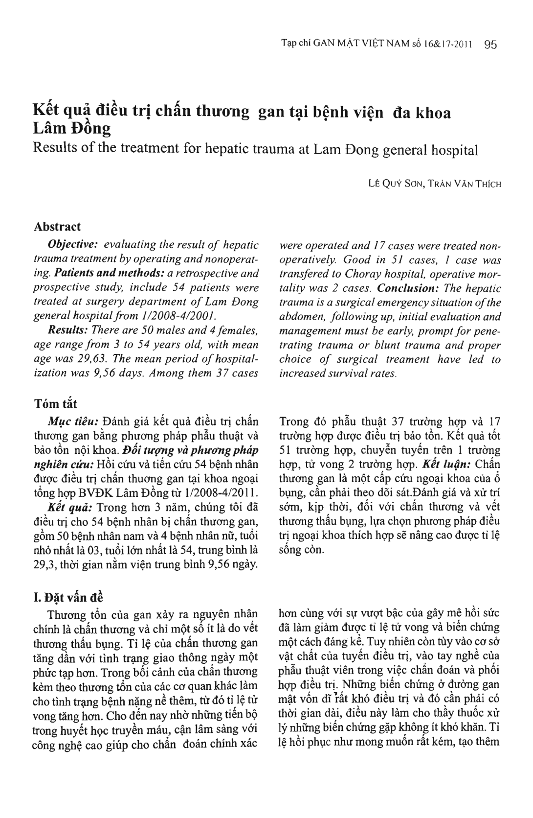Objective: evaluating the result of hepatic trauma treatment by operating and nonoperating. Patients and methods: a retrospective and prospective study, include 54 patients were treated at surgery department of Lam Dong general hospital from 1/2008-4/2001. Results: There are 50 males and 4 females, age range from 3 to 54 years old, with mean age was 29.63. The mean period of hospitalization was 9.56 days. Among them 37 cases were operated and 17 cases were treated nonoperatively. Good in 51 cases, 1 case was transfered to Choray hospital, operative mortality was 2 cases. Conclusion: The hepatic trauma is a surgical emergency situation of the abdomen, following up, initial evaluation and management must be early, prompt for penetrating trauma or blunt trauma and proper choice of surgical treament have led to increased survival rates.