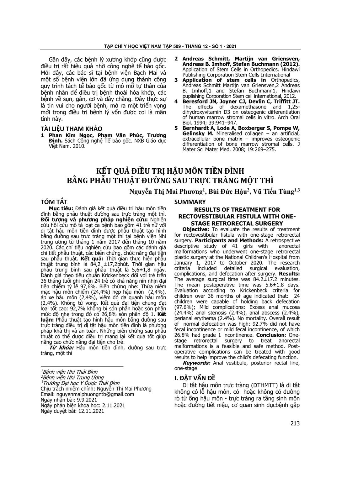 Đánh giá kết quả điều trị hậu môn tiền đình bằng phẫu thuật đường sau trực tràng một thì. Đối tượng và phương pháp nghiên cứu: Nghiên cứu hồi cứu mô tả loạt ca bệnh bao gồm 41 trẻ nữ với dị tật hậu môn tiền đình được phẫu thuật tạo hình bằng đường sau trưc tràng một thì tại bệnh viện Nhi trung ương từ tháng 1 năm 2017 đến tháng 10 năm 2020. Các chỉ tiêu nghiên cứu bao gồm các đánh giá chi tiết phẫu thuật, các biến chứng, chức năng đại tiện sau phẫu thuật. Kết quả: Thời gian thực hiện phẫu thuật trung bình là 84,2 ±17,2phút. Thời gian hậu phẫu trung bình sau phẫu thuật là 5,6±1,8 ngày. Đánh giá theo tiêu chuẩn Krickenbeck đối với trẻ trên 36 tháng tuổi ghi nhận 24 trẻ có khả năng nín nhịn đại tiện chiếm tỷ lệ 97,6%. Biến chứng nhẹ: Thừa niêm mạc hậu môn chiếm (24,4%) hẹp hậu môn (2,4%), áp xe hậu môn (2,4%), viêm đỏ da quanh hậu môn (2,4%). Không tử vong. Kết quả đại tiện chung đạt loai tốt cao: 92,7% không bị són phân hoặc són phân mức độ nhẹ trong đó có 26,8% són phân độ 1. Kết luận: Phẫu thuật tạo hình hậu môn bằng đường sau trực tràng điều trị dị tật hậu môn tiền đình là phương pháp khả thi và an toàn. Những biến chứng sau phẫu thuật có thể được điều trị mang lại kết quả tốt giúp nâng cao chức năng đại tiện cho trẻ.