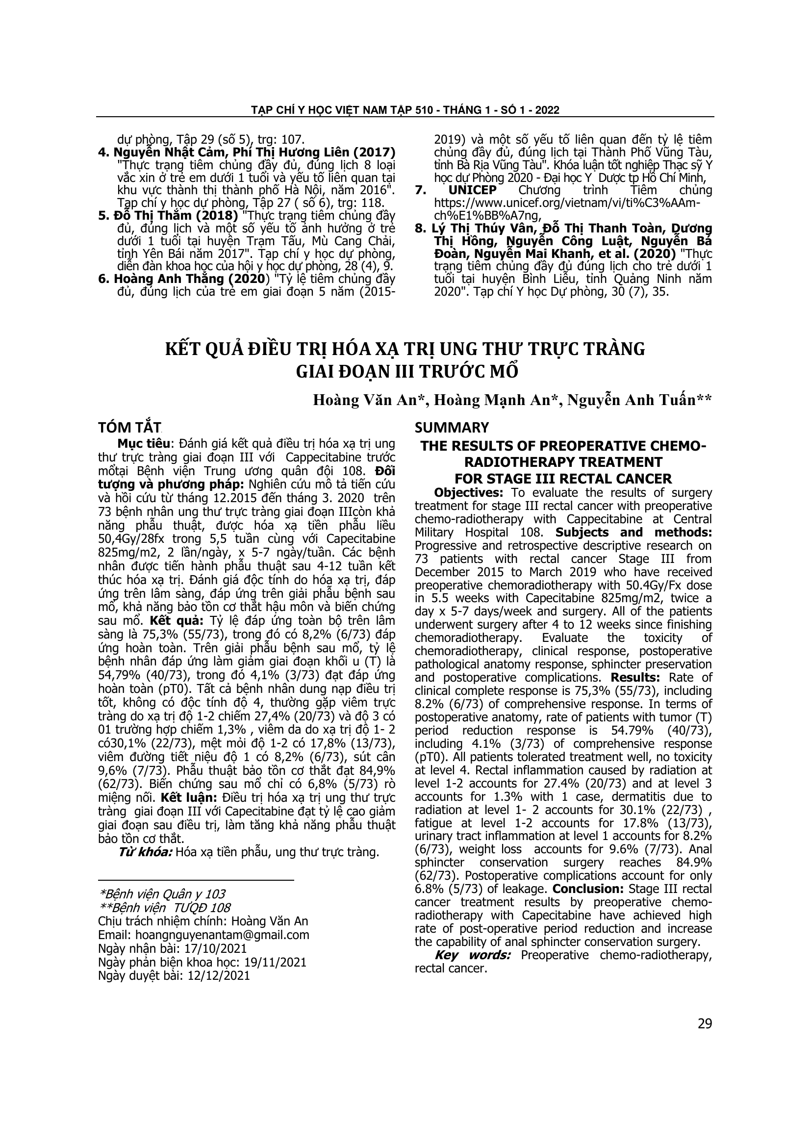Đánh giá kết quả điều trị hóa xạ trị ung thư trực tràng giai đoạn III với Cappecitabine trước mổtại Bệnh viện Trung ương quân đội 108. Đối tượng và phương pháp: Nghiên cứu mô tả tiến cứu và hồi cứu từ tháng 12.2015 đến tháng 3. 2020 trên 73 bệnh nhân ung thư trực tràng giai đoạn IIIcòn khả năng phẫu thuật, được hóa xạ tiền phẫu liều 50,4Gy/28fx trong 5,5 tuần cùng với Capecitabine 825mg/m2, 2 lần/ngày, x 5-7 ngày/tuần. Các bệnh nhân được tiến hành phẫu thuật sau 4-12 tuần kết thúc hóa xạ trị. Đánh giá độc tính do hóa xạ trị, đáp ứng trên lâm sàng, đáp ứng trên giải phẫu bệnh sau mổ, khả năng bảo tồn cơ thắt hậu môn và biến chứng sau mổ. Kết quả: Tỷ lệ đáp ứng toàn bộ trên lâm sàng là 75,3% (55/73), trong đó có 8,2% (6/73) đáp ứng hoàn toàn. Trên giải phẫu bệnh sau mổ, tỷ lệ bệnh nhân đáp ứng làm giảm giai đoạn khối u (T) là 54,79% (40/73), trong đó 4,1% (3/73) đạt đáp ứng hoàn toàn (pT0). Tất cả bệnh nhân dung nạp điều trị tốt, không có độc tính độ 4, thường gặp viêm trực tràng do xạ trị độ 1-2 chiếm 27,4% (20/73) và độ 3 có 01 trường hợp chiếm 1,3% , viêm da do xạ trị độ 1- 2 có30,1% (22/73), mệt mỏi độ 1-2 có 17,8% (13/73), viêm đường tiết niệu độ 1 có 8,2% (6/73), sút cân 9,6% (7/73). Phẫu thuật bảo tồn cơ thắt đạt 84,9% (62/73). Biến chứng sau mổ chỉ có 6,8% (5/73) rò miệng nối. Kết luận: Điều trị hóa xạ trị ung thư trực tràng giai đoạn III với Capecitabine đạt tỷ lệ cao giảm giai đoạn sau điều trị, làm tăng khả năng phẫu thuật bảo tồn cơ thắt.