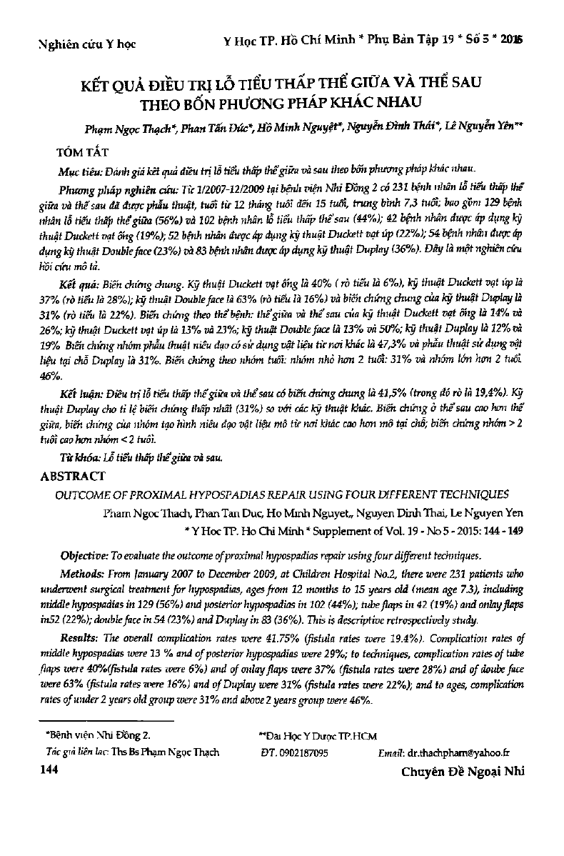 Kết quả điều trị lỗ tiểu thấp thể giữa và thể sau theo bốn phương pháp khác nhau