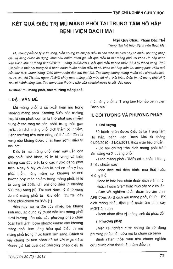Empyema with high mortality, complications and treatment costs. Many therapies for treatment of empyema to help clinicians choose the optimal treatment. The study was to assess the effective treatments of empyema. The results showed that effective treatment: succsess 88.3 percent. 7/60 failure: 6 medical therapy combined drainage (4 operated, 2 septic shock), 1 medical therapy plus drainage combined streptokinase (pleural peel). Effective drain: success 82 percent. 7/39 failure: 6 drainage guided ultrasound. Drainage guided by computerized tomography (CT) had better result than drainage guided by ultrasound. Side effect of streptokinase: fever 76.2 percent; chest pain 66.7 percent; pleural bleeding 9.5 percent; non cases with serious allergy or shock. In conclusion, combined medical treatment and drainage of empyema was effective. Side effect of streptokinase: fever 76.2 percent; chest pain 66.7 percent.