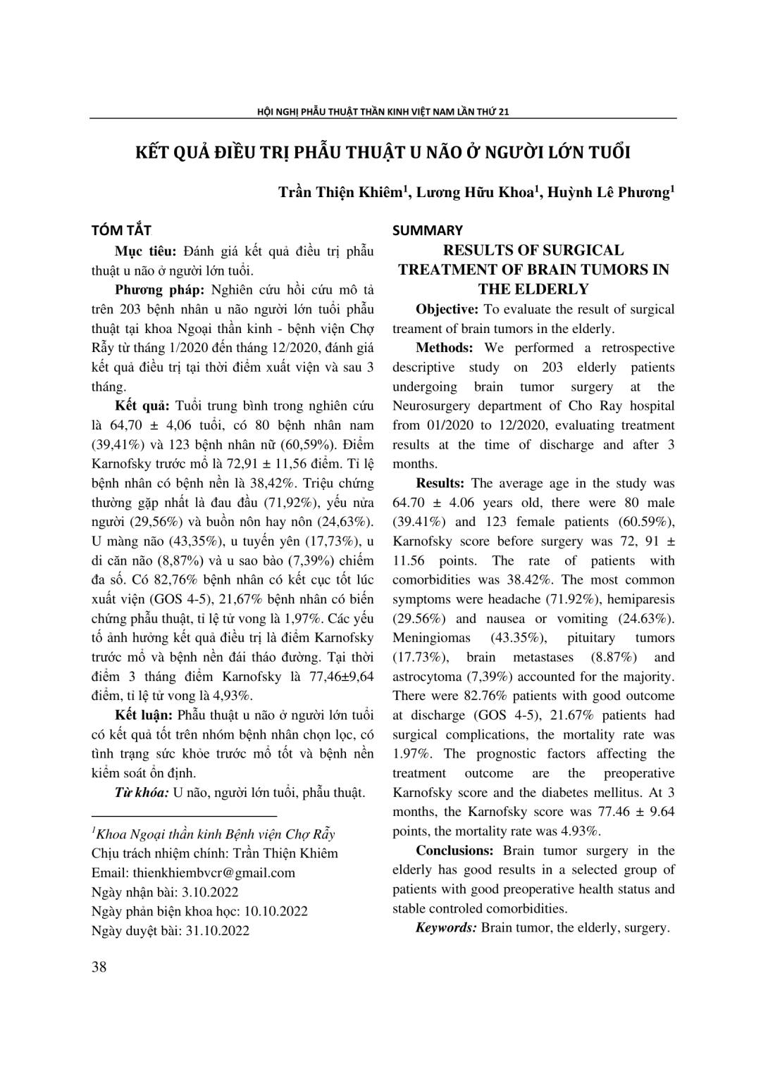 Đánh giá kết quả điều trị phẫu thuật u não ở người lớn tuổi. Phương pháp: Nghiên cứu hồi cứu mô tả trên 203 bệnh nhân u não người lớn tuổi phẫu thuật tại khoa Ngoại thần kinh - bệnh viện Chợ Rẫy từ tháng 1/2020 đến tháng 12/2020, đánh giá kết quả điều trị tại thời điểm xuất viện và sau 3 tháng. Kết quả: Tuổi trung bình trong nghiên cứu là 64,70 ± 4,06 tuổi, có 80 bệnh nhân nam (39,41%) và 123 bệnh nhân nữ (60,59%). Điểm Karnofsky trước mổ là 72,91 ± 11,56 điểm. Tỉ lệ bệnh nhân có bệnh nền là 38,42%. Triệu chứng thường gặp nhất là đau đầu (71,92%), yếu nửa người (29,56%) và buồn nôn hay nôn (24,63%). U màng não (43,35%), u tuyến yên (17,73%), u di căn não (8,87%) và u sao bào (7,39%) chiếm đa số. Có 82,76% bệnh nhân có kết cục tốt lúc xuất viện (GOS 4-5), 21,67% bệnh nhân có biến chứng phẫu thuật, tỉ lệ tử vong là 1,97%. Các yếu tố ảnh hưởng kết quả điều trị là điểm Karnofsky trước mổ và bệnh nền đái tháo đường. Tại thời điểm 3 tháng điểm Karnofsky là 77,46±9,64 điểm, tỉ lệ tử vong là 4,93%.
