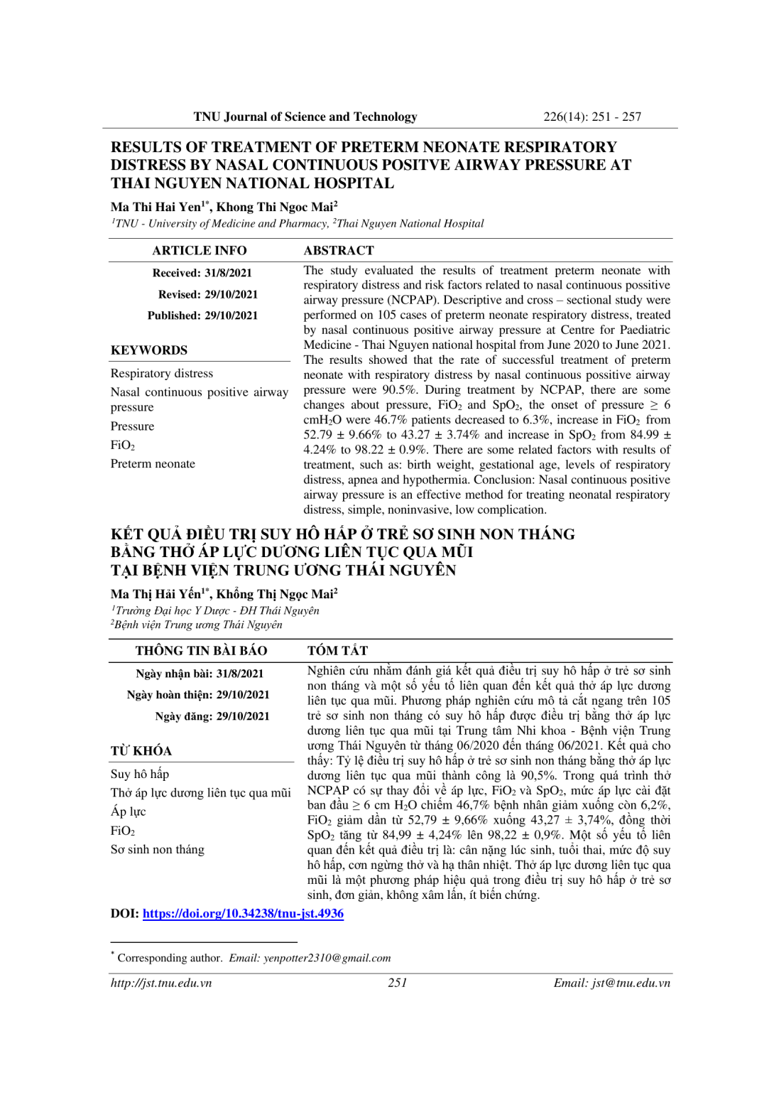 The study evaluated the results of treatment preterm neonate with respiratory distress and risk factors related to nasal continuous possitive airway pressure (NCPAP). Descriptive and cross – sectional study were performed on 105 cases of preterm neonate respiratory distress, treated by nasal continuous positive airway pressure at Centre for Paediatric Medicine - Thai Nguyen national hospital from June 2020 to June 2021. The results showed that the rate of successful treatment of preterm neonate with respiratory distress by nasal continuous possitive airway pressure were 90.5%. During treatment by NCPAP, there are some changes about pressure, FiO2 and SpO2, the onset of pressure ≥ 6 cmH2O were 46.7% patients decreased to 6.3%, increase in FiO2 from 52.79 ± 9.66% to 43.27 ± 3.74% and increase in SpO2 from 84.99 ± 4.24% to 98.22 ± 0.9%. There are some related factors with results of treatment, such as: birth weight, gestational age, levels of respiratory distress, apnea and hypothermia. Conclusion: Nasal continuous positive airway pressure is an effective method for treating neonatal respiratory distress, simple, noninvasive, low complication.