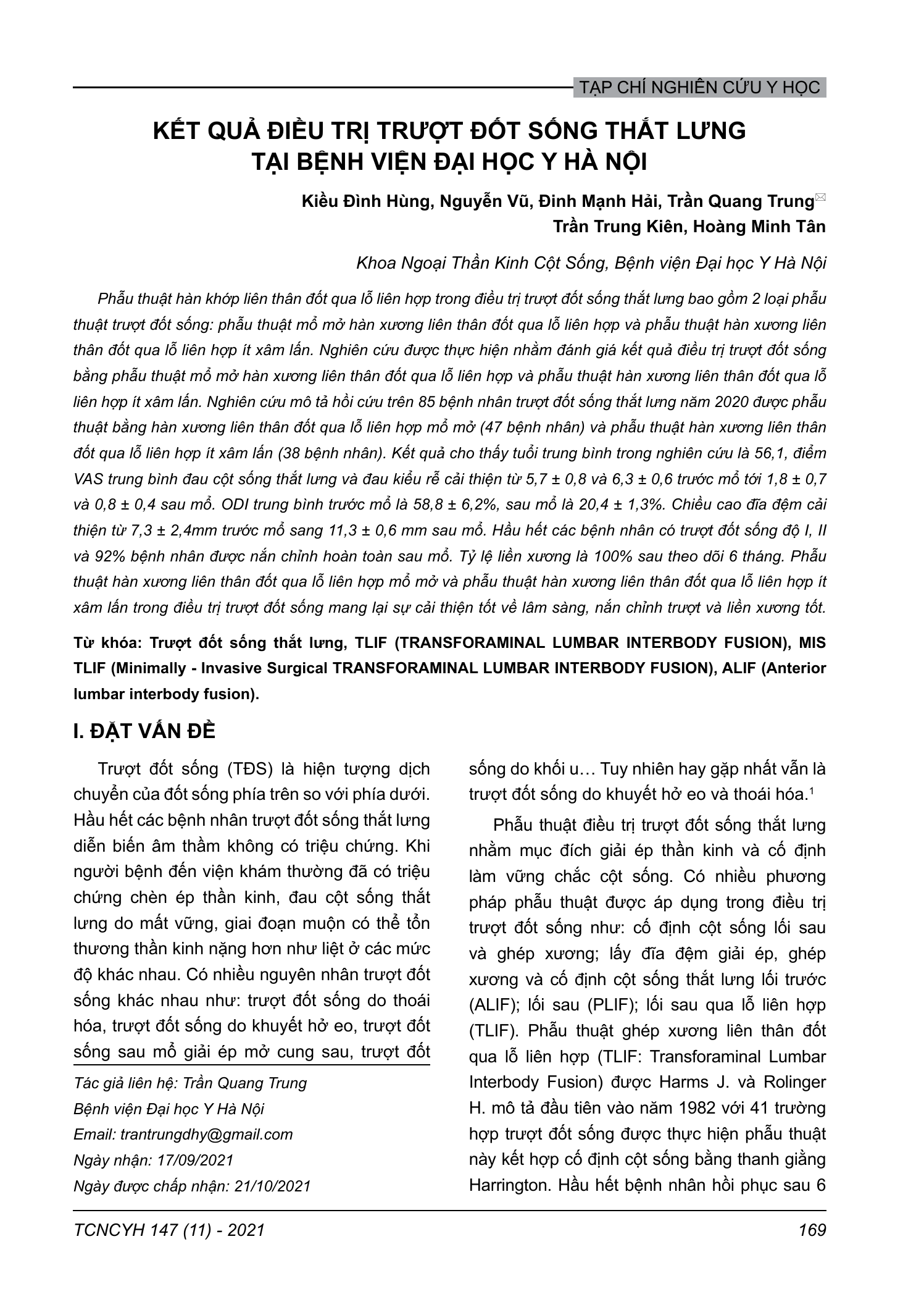 Phẫu thuật hàn khớp liên thân đốt qua lỗ liên hợp trong điều trị trượt đốt sống thắt lưng bao gồm 2 loại phẫu thuật trượt đốt sống: phẫu thuật mổ mở hàn xương liên thân đốt qua lỗ liên hợp và phẫu thuật hàn xương liên thân đốt qua lỗ liên hợp ít xâm lấn. Nghiên cứu được thực hiện nhằm đánh giá kết quả điều trị trượt đốt sống bằng phẫu thuật mổ mở hàn xương liên thân đốt qua lỗ liên hợp và phẫu thuật hàn xương liên thân đốt qua lỗ liên hợp ít xâm lấn. Nghiên cứu mô tả hồi cứu trên 85 bệnh nhân trượt đốt sống thắt lưng năm 2020 được phẫu thuật bằng hàn xương liên thân đốt qua lỗ liên hợp mổ mở (47 bệnh nhân) và phẫu thuật hàn xương liên thân đốt qua lỗ liên hợp ít xâm lấn (38 bệnh nhân). Kết quả cho thấy tuổi trung bình trong nghiên cứu là 56,1, điểm VAS trung bình đau cột sống thắt lưng và đau kiểu rễ cải thiện từ 5,7 ± 0,8 và 6,3 ± 0,6 trước mổ tới 1,8 ± 0,7 và 0,8 ± 0,4 sau mổ. ODI trung bình trước mổ là 58,8 ± 6,2%, sau mổ là 20,4 ± 1,3%. Chiều cao đĩa đệm cải thiện từ 7,3 ± 2,4mm trước mổ sang 11,3 ± 0,6 mm sau mổ. Hầu hết các bệnh nhân có trượt đốt sống độ I, II và 92% bệnh nhân được nắn chỉnh hoàn toàn sau mổ. Tỷ lệ liền xương là 100% sau theo dõi 6 tháng. Phẫu thuật hàn xương liên thân đốt qua lỗ liên hợp mổ mở và phẫu thuật hàn xương liên thân đốt qua lỗ liên hợp ít xâm lấn trong điều trị trượt đốt sống mang lại sự cải thiện tốt về lâm sàng, nắn chỉnh trượt và liền xương tốt.