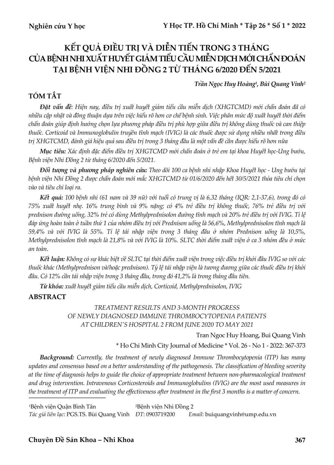Hiện nay, điều trị xuất huyết giảm tiểu cầu miễn dịch (XHGTCMD) mới chẩn đoán đã có nhiều cập nhật và đồng thuận dựa trên việc hiểu rõ hơn cơ chế bệnh sinh. Việc phân mức độ xuất huyết thời điểm chẩn đoán giúp định hướng chọn lựa phương pháp điều trị phù hợp giữa điều trị không dùng thuốc và can thiệp thuốc. Corticoid và Immunoglobulin truyền tĩnh mạch (IVIG) là các thuốc được sử dụng nhiều nhất trong điều trị XHGTCMD, đánh giá hiệu quả sau điều trị trong 3 tháng đầu là một vấn đề cần được hiểu rõ hơn nữa Mục tiêu: Xác định đặc điểm điều trị XHGTCMD mới chẩn đoán ở trẻ em tại khoa Huyết học-Ung bướu, Bệnh viện Nhi Đồng 2 từ tháng 6/2020 đến 5/2021. Đối tượng và phương pháp nghiên cứu: Theo dõi 100 ca bệnh nhi nhập Khoa Huyết học - Ung bướu tại bệnh viện Nhi Đồng 2 được chẩn đoán mới mắc XHGTCMD từ 01/6/2020 đến hết 30/5/2021 thỏa tiêu chí chọn vào và tiêu chí loại ra. Kết quả: 100 bệnh nhi (61 nam và 39 nữ) với tuổi có trung vị là 6,32 tháng (IQR: 2,1-37,6), trong đó có 75% xuất huyết nhẹ. 16% trung bình và 9% nặng; có 4% trẻ điều trị không thuốc, 76% trẻ điều trị với prednison đường uống, 32% trẻ có dùng Methylprednisolon đường tĩnh mạch và 20% trẻ điều trị với IVIG. Tỉ lệ đáp ứng hoàn toàn ở tuần thứ 1 của nhóm điều trị với Prednison uống là 56,6%, Methylprednisolon tĩnh mạch là 59,4% và với IVIG là 55%. Tỉ lệ tái nhập viện trong 3 tháng đầu ở nhóm Prednison uống là 10,5%, Methylprednisolon tĩnh mạch là 21,8% và với IVIG là 10%. SLTC thời điểm xuất viện ở ca 3 nhóm đều ở mức an toàn. Kết luận: Không có sự khác biệt về SLTC tại thời điểm xuất viện trong việc điều trị khởi đầu IVIG so với các thuốc khác (Methylprednison và/hoặc prednison). Tỷ lệ tái nhập viện là tương đương giữa các thuốc điều trị khởi đầu. Có 12% cần tái nhập viện trong 3 tháng đầu, trong đó 41,2% là trong tháng đầu tiên.