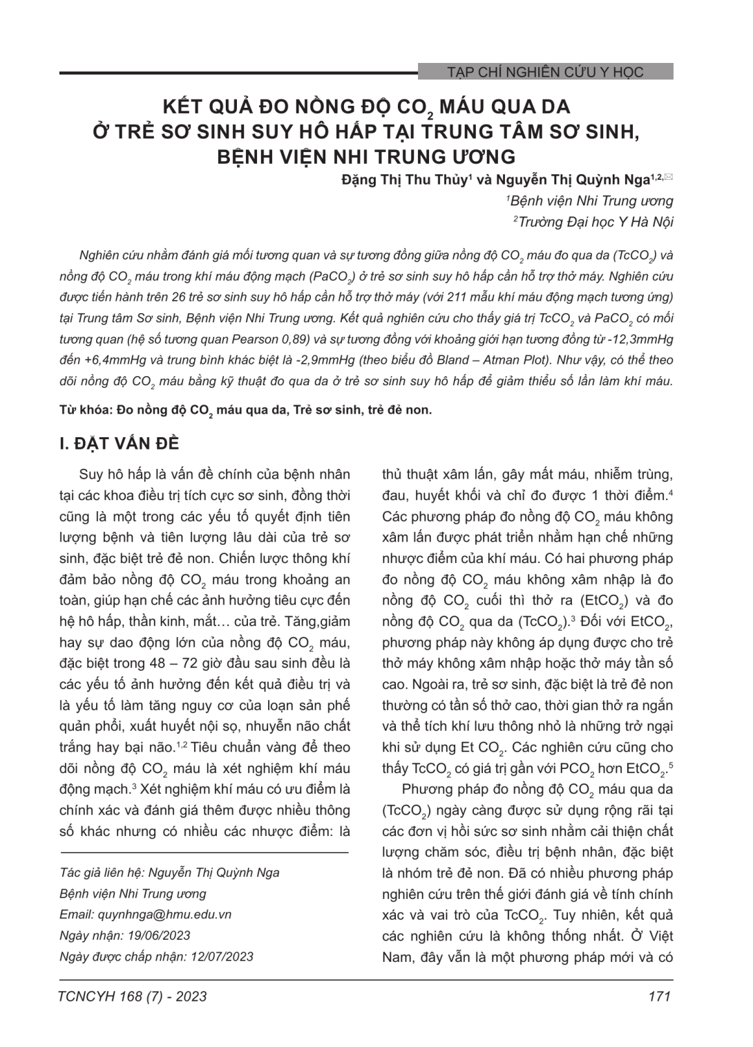 Nghiên cứu nhằm đánh giá mối tương quan và sự tương đồng giữa nồng độ CO2 máu đo qua da (TcCO2) và nồng độ CO2 máu trong khí máu động mạch (PaCO2) ở trẻ sơ sinh suy hô hấp cần hỗ trợ thở máy. Nghiên cứu được tiến hành trên 26 trẻ sơ sinh suy hô hấp cần hỗ trợ thở máy (với 211 mẫu khí máu động mạch tương ứng) tại Trung tâm Sơ sinh, Bệnh viện Nhi Trung ương. Kết quả nghiên cứu cho thấy giá trị TcCO2 và PaCO2 có mối tương quan (hệ số tương quan Pearson 0,89) và sự tương đồng với khoảng giới hạn tương đồng từ -12,3mmHg đến +6,4mmHg và trung bình khác biệt là -2,9mmHg (theo biểu đồ Bland – Atman Plot). Như vậy, có thể theo dõi nồng độ CO2 máu bằng kỹ thuật đo qua da ở trẻ sơ sinh suy hô hấp để giảm thiểu số lần làm khí máu.