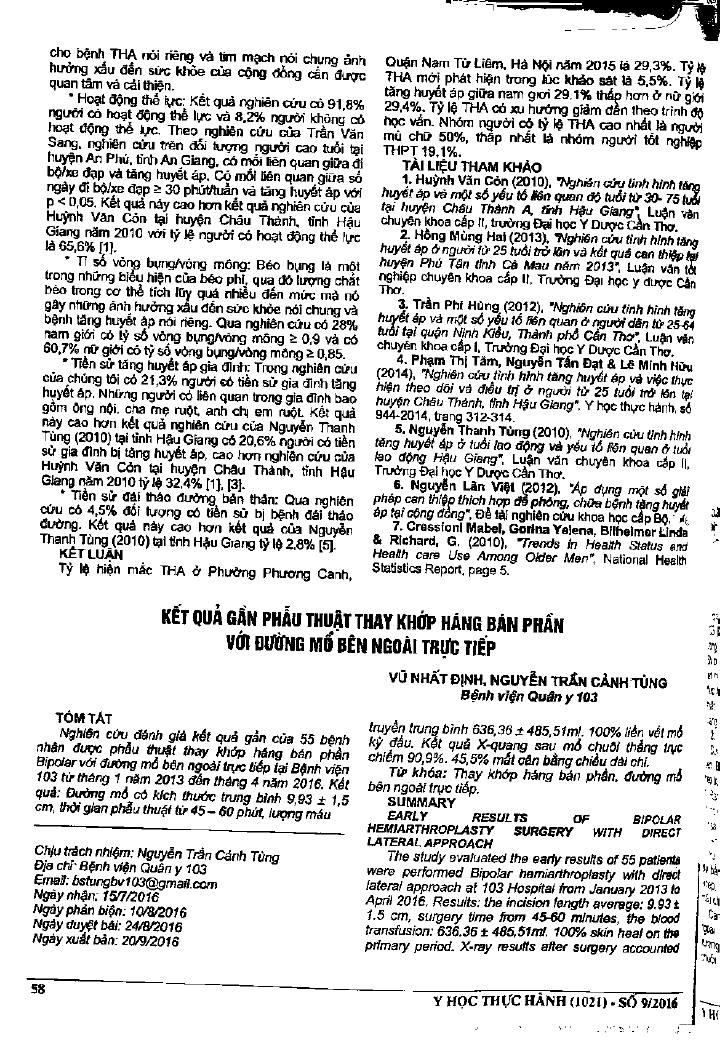 Đánh giá kết quả phẫu thuật thay khớp háng bán phần Bipolar với đường mổ bên ngoài trực tiếp cho 55 bệnh nhân tại Bệnh viện 103 từ 1/2013 đến 4/2016, kết quả cho thấy đường mổ có kích thước trung bình 9,93 cộng trừ 1,5 cm; thời gian phẫu thuật wtf 45-60 phút, lượng máu truyền trung bình 636,36 cộng trừ 485, 51 ml. 100 phần trăm liền vết mổ kỳ đầu. Kết quả Xquang sau mổ chuôi thẳng trục chiếm 90,9 phần trăm. Có 45,4 phần trăm mất cân bằng chiều dài chi.