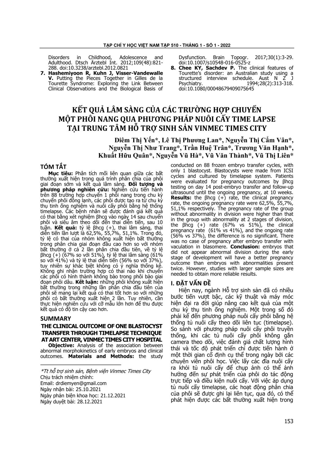 Phân tích mối liên quan giữa các bất thường xuất hiện trong quá trình phân chia của phôi giai đoạn sớm và kết quả lâm sàng. Đối tượng và phương pháp nghiên cứu: Nghiên cứu tiến hành trên 88 trường hợp chuyển 1 phôi nang trong chu kỳ chuyển phôi đông lạnh, các phôi được tạo ra từ chu kỳ thụ tinh ống nghiệm và nuôi cấy phôi bằng hệ thống timelapse. Các bệnh nhân sẽ được đánh giá kết quả có thai bằng xét nghiệm βhcg vào ngày 14 sau chuyển phôi và siêu âm theo dõi đến thai diễn tiến, sau 10 tuần. Kết quả: tỷ lệ βhcg (+), thai lâm sàng, thai diễn tiến lần lượt là 62,5%, 55,7%, 51,1%. Trong đó, tỷ lệ có thai của nhóm không xuất hiện bất thường trong phân chia giai đoạn đầu cao hơn so với nhóm bất thường ở cả 2 lần phân chia đầu tiên, về tỷ lệ βhcg (+) (67% so với 51%), tỷ lệ thai lâm sàng (61% so với 41%) và tỷ lệ thai diễn tiến (56% so với 37%), tuy nhiên sự khác biệt không có ý nghĩa thống kê. Không ghi nhận trường hợp có thai nào khi chuyển các phôi có hình thành không bào trong phôi bào giai đoạn phôi dâu. Kết luận: những phôi không xuất hiện bất thường trong những lần phân chia đầu tiên của phôi sẽ mang lại kết quả có thai tốt hơn so với những phôi có bất thường xuất hiện 2 lần. Tuy nhiên, cần thực hiện nghiên cứu với cỡ mẫu lớn hơn để thu được kết quả có độ tin cậy cao hơn.