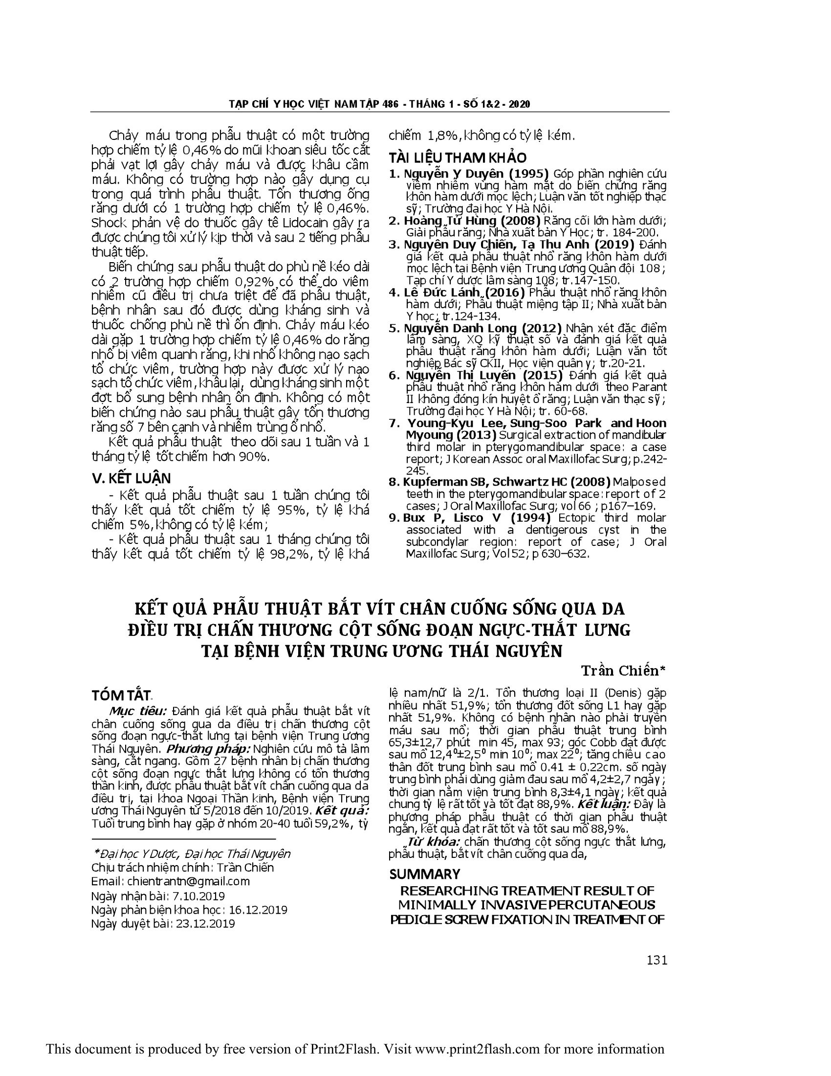 Nghiên cứu có mục tiêu là đánh giá kết quả phẫu thuật bắt vít chân cuống sống qua da điêu trị chấn thương cột sống đoạn ngực-thắt lưng tại bệnh viện Trung ương Thái Nguyên. Nghiên cứu mô tả lầm sàng, cát ngang. Gồm 27 bệnh nhân bị chấn thương cột sống đoạn ngực thắt lưng không có tổn thương thần kinh, được phẫu thuật bắt vít chân cuống qua da điều trị, tại khoa Ngoại Thần kinh, Bệnh viện Trung ương Thái Nguyên từ 5/2018 đến 10/2019. Nghiên cứu cho kết quả là tuổi trung bình hay gặp ở nhóm 20-40 tuổi 59,2%, tỷ lệ nam/nữ là 2/1. Tôn thương loại II (Denis) gặp nhiều nhất 51,9%; tổn thương đốt sống L1 hay gặp nhất 51,9%. Không có bệnh nhân nào phải truyền máu sau mổ, thời gian phẫu thuật trung bình 65,3±12,7 phút min 45, max 93; góc Cobb đạt được sau mổ 12,4°±2,5° min 10°; max 22°; tăng chiều cao thân đốt trung bình sau mổ 0.41 ± 0.22cm. số ngày trung bình phải dùng giảm đau sau mỗ 4,2±2,7 ngày ; thời gian nằm viện trung bình 8,3±4,1 ngày; kết quả chung tỷ lệ rất tốt và tốt đạt 88,9%. Đây là phương pháp phẫu thuật có thời gian phẫu thuật ngắn, kết quả đạt rất tốt và tốt sau mổ 88,9%.