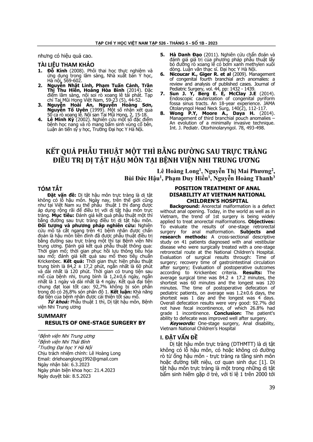 Anorectal malformation is a defect without anal opening. Today, in the world as well as in Vietnam, the trend of 1st surgery is being widely applied to treat anorectal malformations. Objectives: To evaluate the results of one-stage retrorectal surgery for anal malformation. Subjects and research methods: A cross-sectional descriptive study on 41 patients diagnosed with anal vestibular disease who were surgically treated with a one-stage retrorectal route at the National Children's Hospital. Evaluation of surgical results through: Time of surgery; recovery time of gastrointestinal circulation after surgery; Evaluation of postoperative outcomes according to Krickenbec criteria. Results: The average surgical time was 84.2 ± 17.2 minutes, the shortest was 60 minutes and the longest was 120 minutes. The time of postoperative defecation of pediatric patients, on average was 1.2±0.6 days, the shortest was 1 day and the longest was 4 days. Overall defecation results were very good: 92.7% did not have fecal incontinence, of which 26.8% had grade 1 incontinence. Conclusion: The patient's ability to defecate was improved well after surgery.