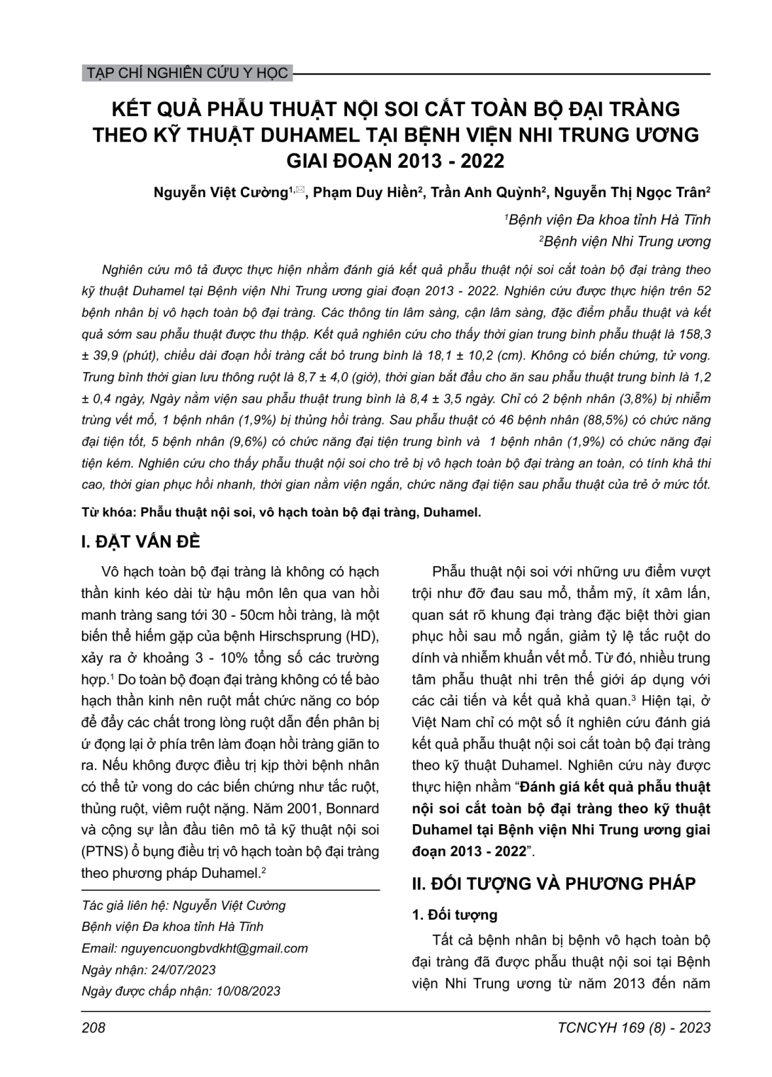 Nghiên cứu mô tả được thực hiện nhằm đánh giá kết quả phẫu thuật nội soi cắt toàn bộ đại tràng theo kỹ thuật Duhamel tại Bệnh viện Nhi Trung ương giai đoạn 2013 - 2022. Nghiên cứu được thực hiện trên 52 bệnh nhân bị vô hạch toàn bộ đại tràng. Các thông tin lâm sàng, cận lâm sàng, đặc điểm phẫu thuật và kết quả sớm sau phẫu thuật được thu thập. Kết quả nghiên cứu cho thấy thời gian trung bình phẫu thuật là 158,3 ± 39,9 (phút), chiều dài đoạn hồi tràng cắt bỏ trung bình là 18,1 ± 10,2 (cm). Không có biến chứng, tử vong. Trung bình thời gian lưu thông ruột là 8,7 ± 4,0 (giờ), thời gian bắt đầu cho ăn sau phẫu thuật trung bình là 1,2 ± 0,4 ngày, Ngày nằm viện sau phẫu thuật trung bình là 8,4 ± 3,5 ngày. Chỉ có 2 bệnh nhân (3,8%) bị nhiễm trùng vết mổ, 1 bệnh nhân (1,9%) bị thủng hồi tràng. Sau phẫu thuật có 46 bệnh nhân (88,5%) có chức năng đại tiện tốt, 5 bệnh nhân (9,6%) có chức năng đại tiện trung bình và 1 bệnh nhân (1,9%) có chức năng đại tiện kém. Nghiên cứu cho thấy phẫu thuật nội soi cho trẻ bị vô hạch toàn bộ đại tràng an toàn, có tính khả thi cao, thời gian phục hồi nhanh, thời gian nằm viện ngắn, chức năng đại tiện sau phẫu thuật của trẻ ở mức tốt.
