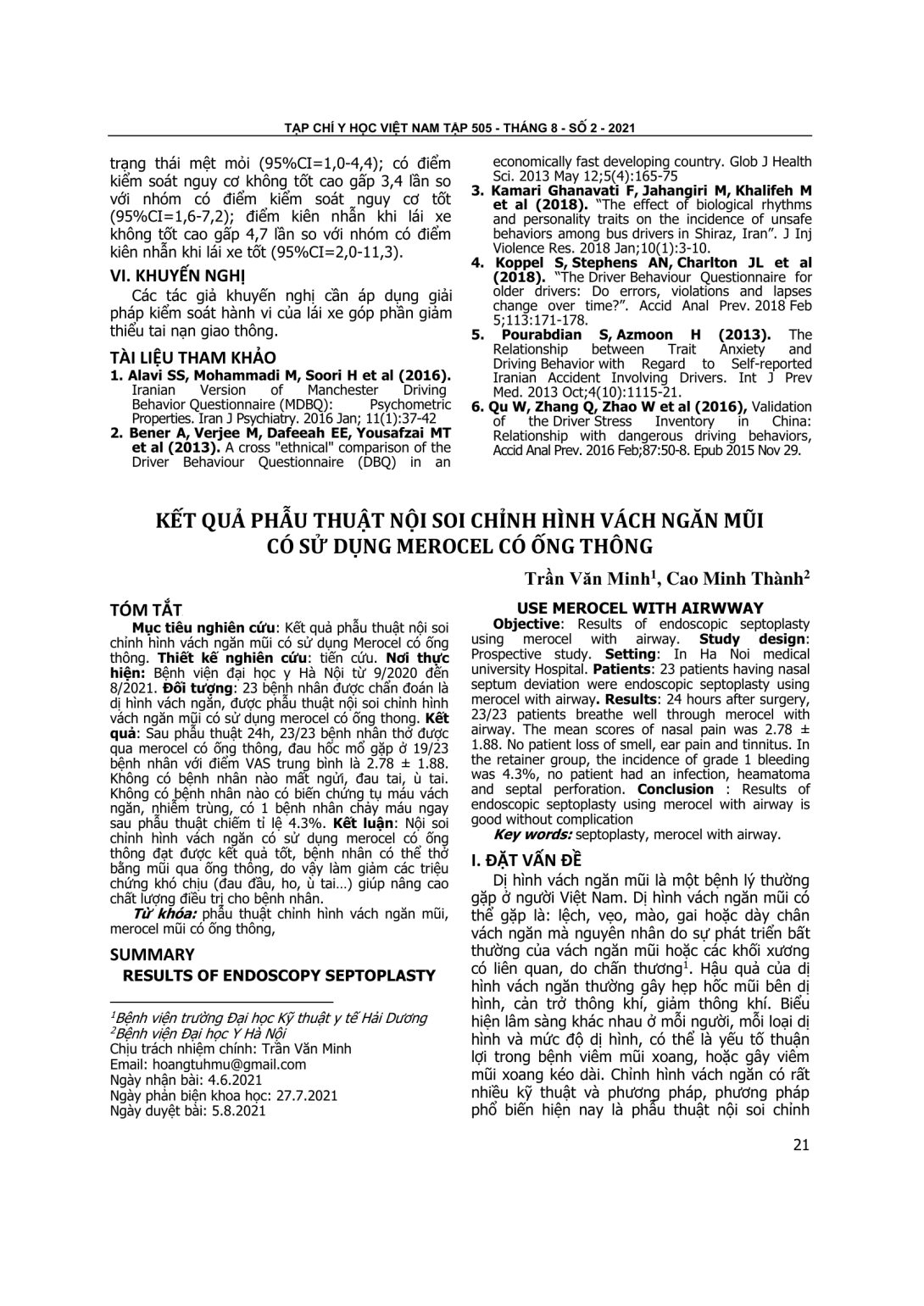 Kết quả phẫu thuật nội soi chỉnh hình vách ngăn mũi có sử dụng Merocel có ống thông. Thiết kế nghiên cứu: tiến cứu. Nơi thực hiện: Bệnh viện đại học y Hà Nội từ 9/2020 đến 8/2021. Đối tượng: 23 bệnh nhân được chẩn đoán là dị hình vách ngăn, được phẫu thuật nội soi chỉnh hình vách ngăn mũi có sử dụng merocel có ống thong. Kết quả: Sau phẫu thuật 24h, 23/23 bệnh nhân thở được qua merocel có ống thông, đau hốc mổ gặp ở 19/23 bệnh nhân với điểm VAS trung bình là 2.78 ± 1.88. Không có bệnh nhân nào mất ngửi, đau tai, ù tai. Không có bệnh nhân nào có biến chứng tụ máu vách ngăn, nhiễm trùng, có 1 bệnh nhân chảy máu ngay sau phẫu thuật chiếm tỉ lệ 4.3%. Kết luận: Nội soi chỉnh hình vách ngăn có sử dụng merocel có ống thông đạt được kết quả tốt, bệnh nhân có thể thở bằng mũi qua ống thông, do vậy làm giảm các triệu chứng khó chịu (đau đầu, ho, ù tai…) giúp nâng cao chất lượng điều trị cho bệnh nhân.