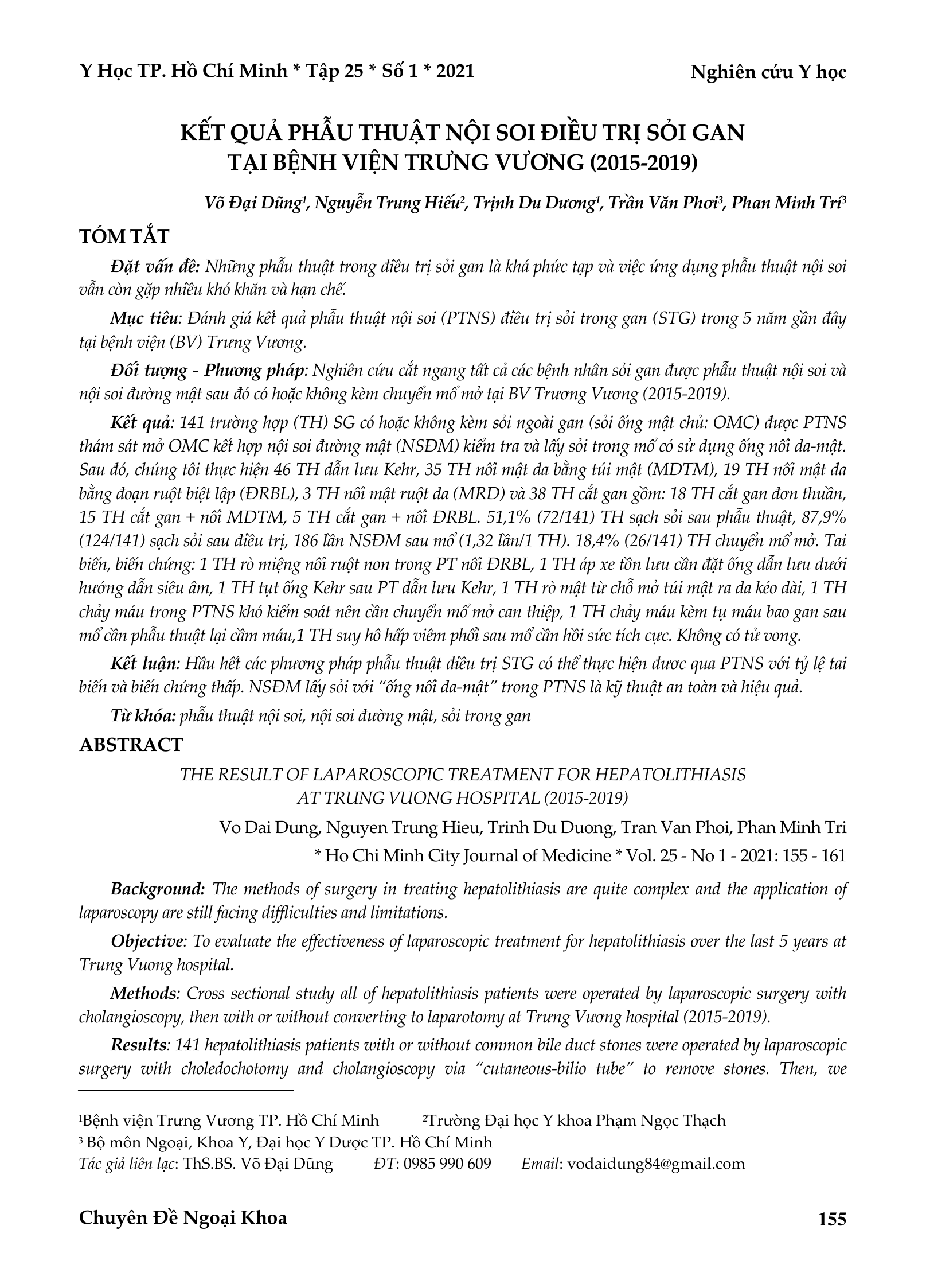 Đánh giá kết quả phẫu thuật nội soi (PTNS) điều trị sỏi trong gan (STG) trong 5 năm gần đây tại bệnh viện (BV) Trưng Vương. Đối tượng - Phương pháp Nghiên cứu cắt ngang tất cả các bệnh nhân sỏi gan được phẫu thuật nội soi và nội soi đường mật sau đó có hoặc không kèm chuyển mổ mở tại BV Trương Vương (2015-2019). Kết quả 141 trường hợp (TH) SG có hoặc không kèm sỏi ngoài gan (sỏi ống mật chủ OMC) được PTNS thám sát mở OMC kết hợp nội soi đường mật (NSĐM) kiểm tra và lấy sỏi trong mổ có sử dụng ống nối da-mật. Sau đó, chúng tôi thực hiện 46 TH dẫn lưu Kehr, 35 TH nối mật da bằng túi mật (MDTM), 19 TH nối mật da bằng đoạn ruột biệt lập (ĐRBL), 3 TH nối mật ruột da (MRD) và 38 TH cắt gan gồm 18 TH cắt gan đơn thuần, 15 TH cắt gan + nối MDTM, 5 TH cắt gan + nối ĐRBL. 51,1% (72/141) TH sạch sỏi sau phẫu thuật, 87,9% (124/141) sạch sỏi sau điều trị, 186 lần NSĐM sau mổ (1,32 lần/1 TH). 18,4% (26/141) TH chuyển mổ mở. Tai biến, biến chứng 1 TH rò miệng nối ruột non trong PT nối ĐRBL, 1 TH áp xe tồn lưu cần đặt ống dẫn lưu dưới hướng dẫn siêu âm, 1 TH tụt ống Kehr sau PT dẫn lưu Kehr, 1 TH rò mật từ chỗ mở túi mật ra da kéo dài, 1 TH chảy máu trong PTNS khó kiểm soát nên cần chuyển mổ mở can thiệp, 1 TH chảy máu kèm tụ máu bao gan sau mổ cần phẫu thuật lại cầm máu,1 TH suy hô hấp viêm phổi sau mổ cần hồi sức tích cực. Không có tử vong. Kết luận Hầu hết các phương pháp phẫu thuật điều trị STG có thể thực hiện đươc qua PTNS với tỷ lệ tai biến và biến chứng thấp. NSĐM lấy sỏi với “ống nối da-mật” trong PTNS là kỹ thuật an toàn và hiệu quả.